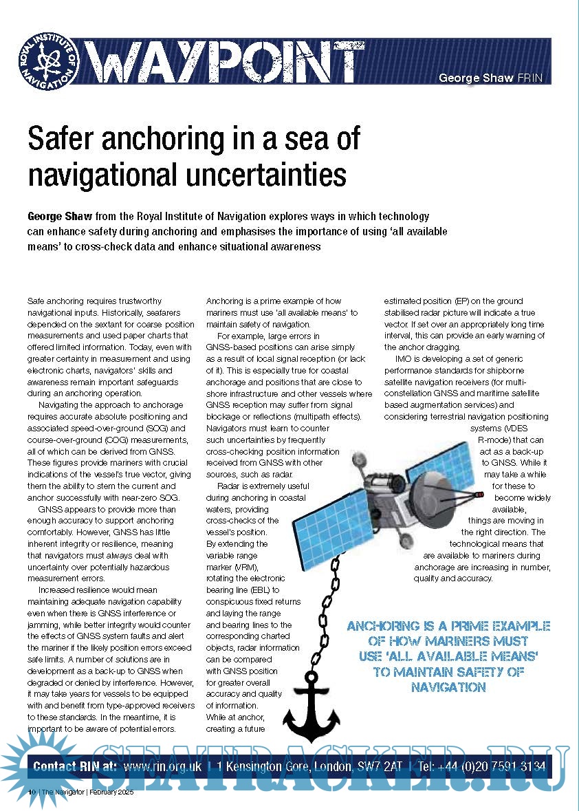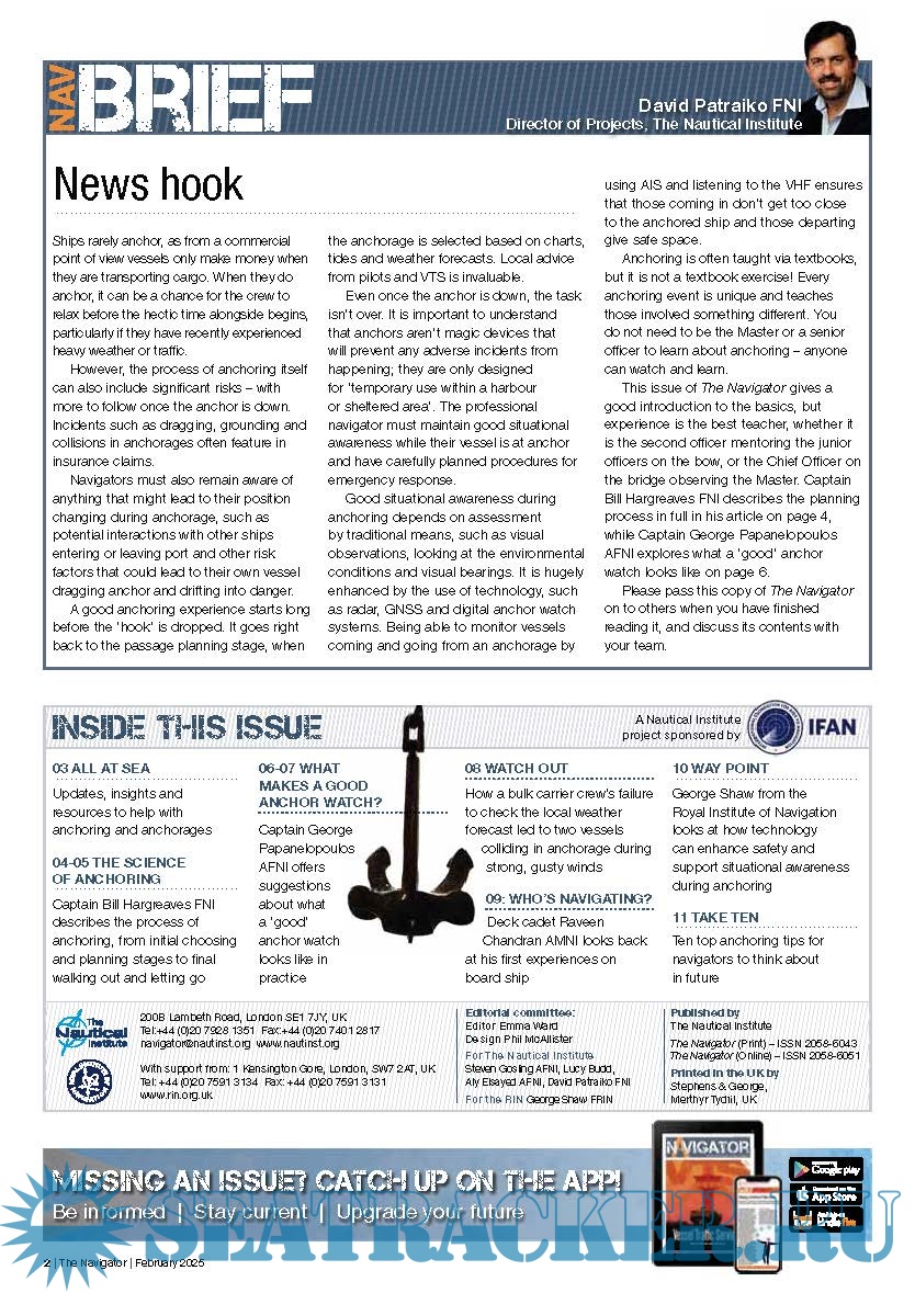 Year: 2025 Language: English Author: The Nautical Institute Genre: Magazine, Periodical publication Edition: Issue no.38 February, 2025 Format: PDF Quality: eBook Pages count: 12 Description: Inspiring professionalism in marine navigators! The Navigator a publication from The Nautical Institute that champions the role of today's professional marine navigators. Published in association with the Royal Institute of Navigation.