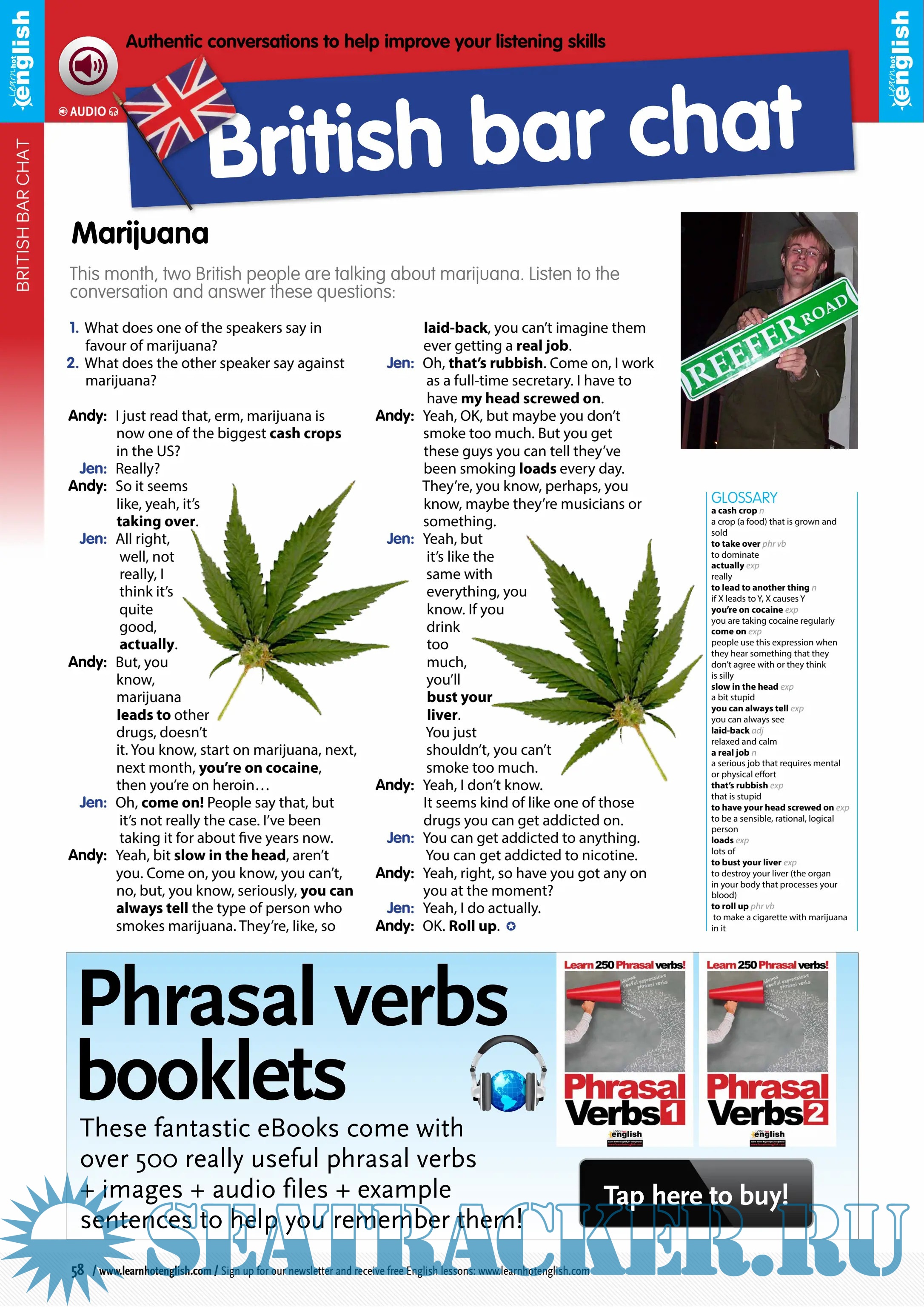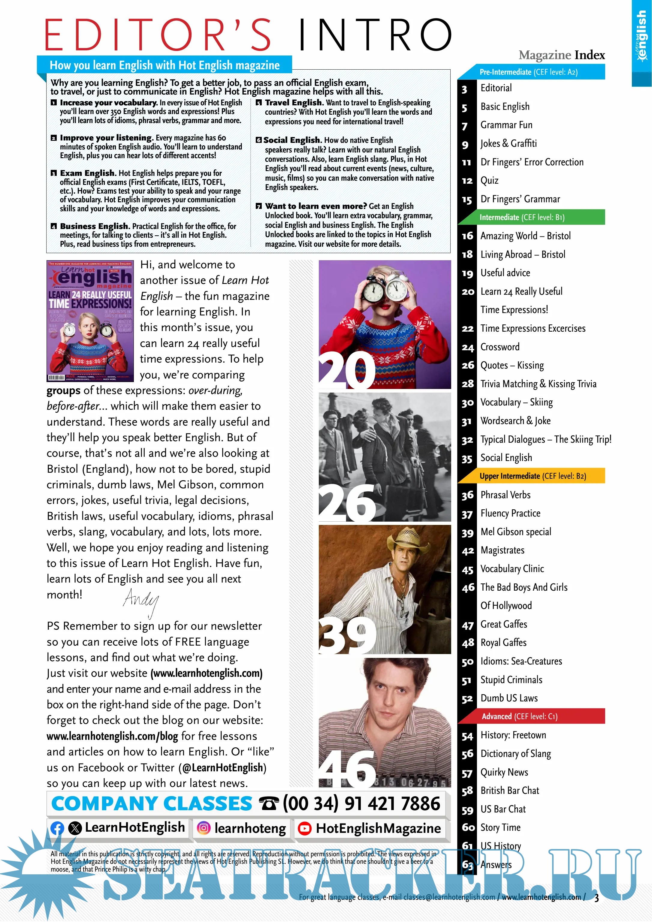 Description: English for all levels (easy – advanced). A monthly magazine for learning English. Idioms, phrasal verbs, useful expressions, grammar, vocabulary. Learn faster because it’s fun!