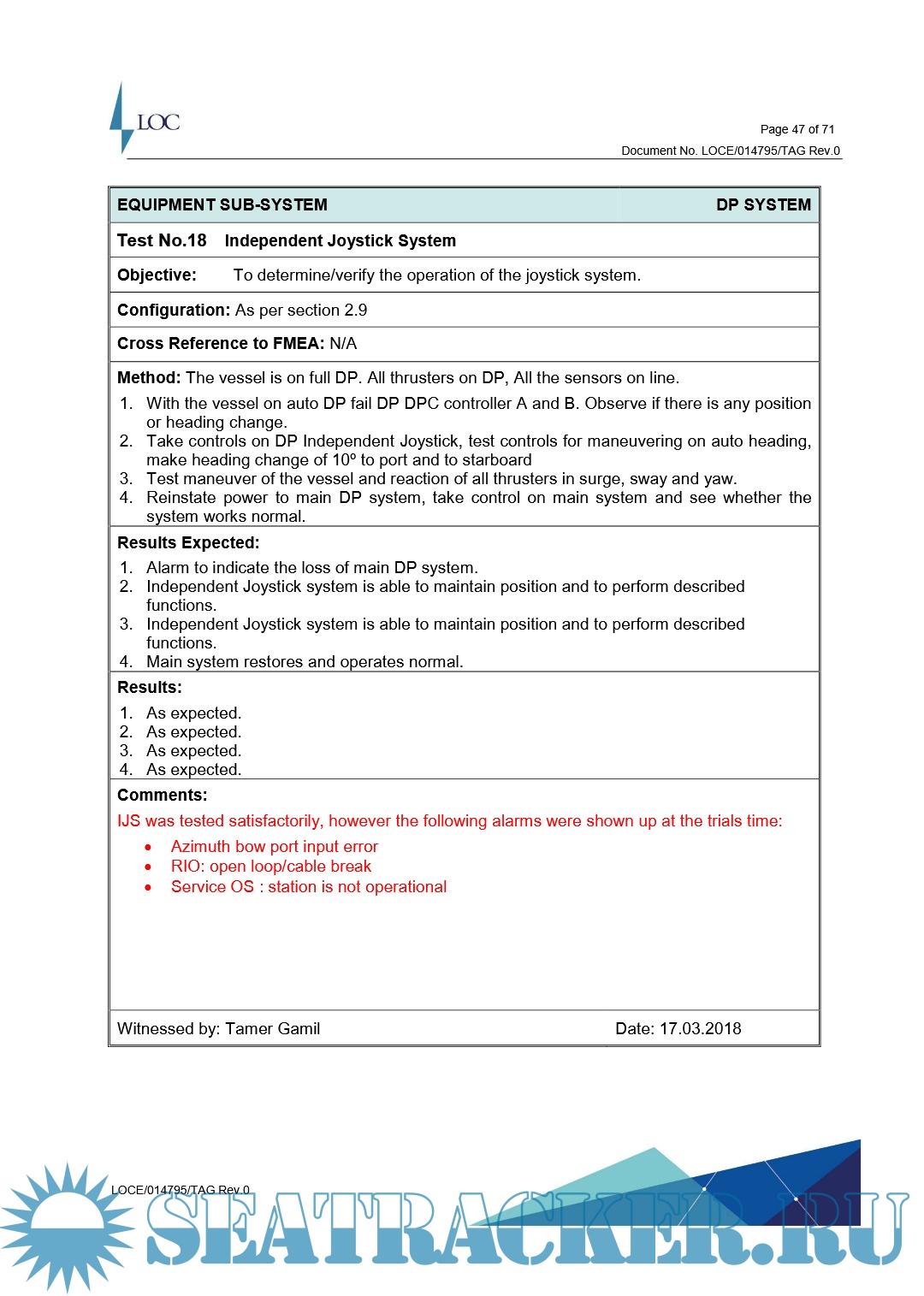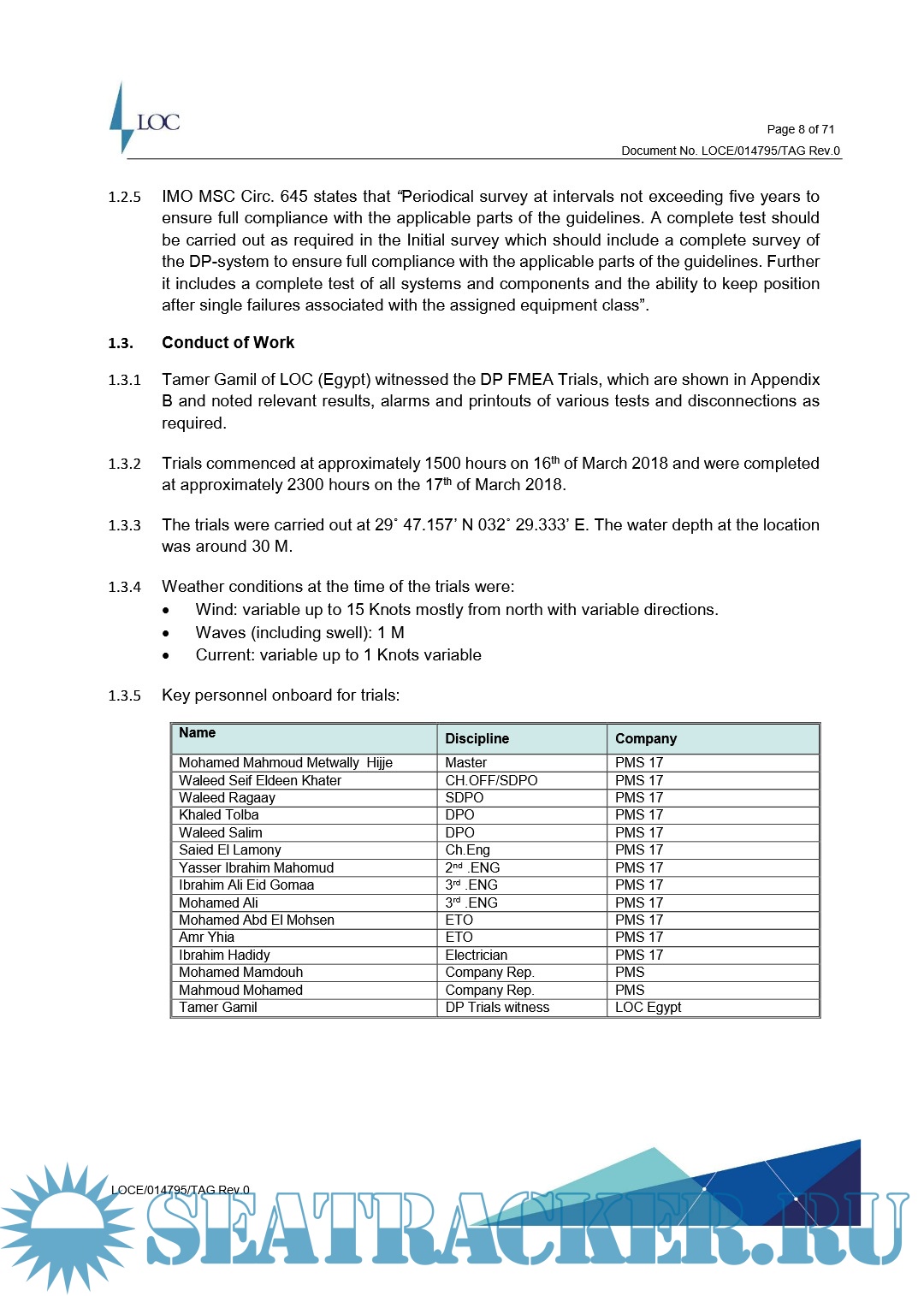 Tamer Gamil of LOC (Egypt) attended the vessel at 1240 hrs at Suez waiting area. The trials were conducted around a position of 29˚ 47.157’ N 032˚ 29.333’ E from the 16th to 17th March 2018 in accordance with the FMEA trials document.