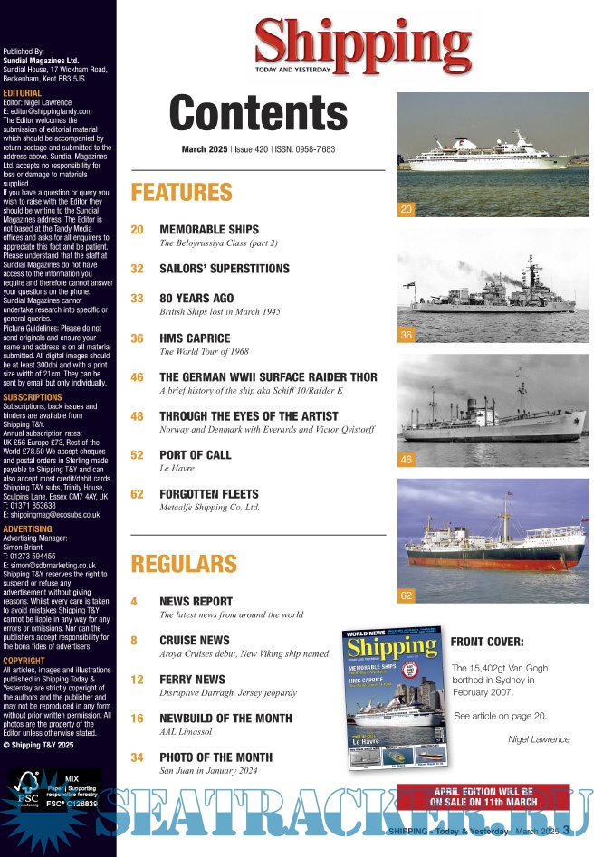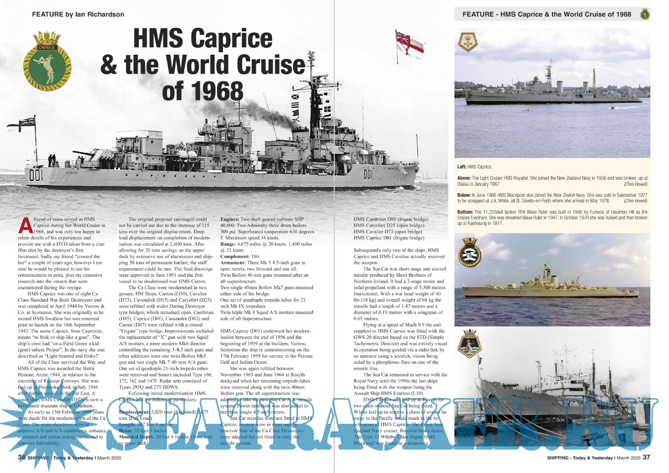 Description: Warships IFR puts the spotlight on the latest developments in the world’s navies. It covers current defence issues and has comments by leading analysts. The magazine regularly includes features on the Royal Navy and the US Navy in addition to incorporating news and features on all other navies across the globe. Warships IFR frequently carries in-depth articles on naval heritage.WARSHIPS International Fleet Review is published 12 times a year by Tandy Media Ltd who also publish Shipping Today & Yesterday (which provides news and features from the world of merchant shipping).