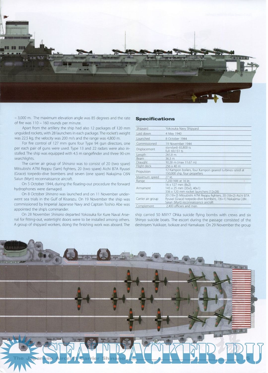 Description: On 4 May 1940 the third Yamato-class battleship was laid down at the Navy Shipyard in Yokosuka. It was to be named Shinano, after a province on the Honshu island, in Nagato prefecture. That was also the name of the longest river in Japan (320 km). Admiral Yamamoto was born at its banks. Due to material supply difficulties, in December 1940 the construction was suspended. In 1942, after Japanese defeat at Midway (four aircraft carriers were lost) it was decided to continue the construction of the ship as an aircraft carrier, in order to partially make up for losses suffered in this class of ships. The rebuilding scheme was designed by Vice Admirals Keji Fukuda and Seichi Izamura.