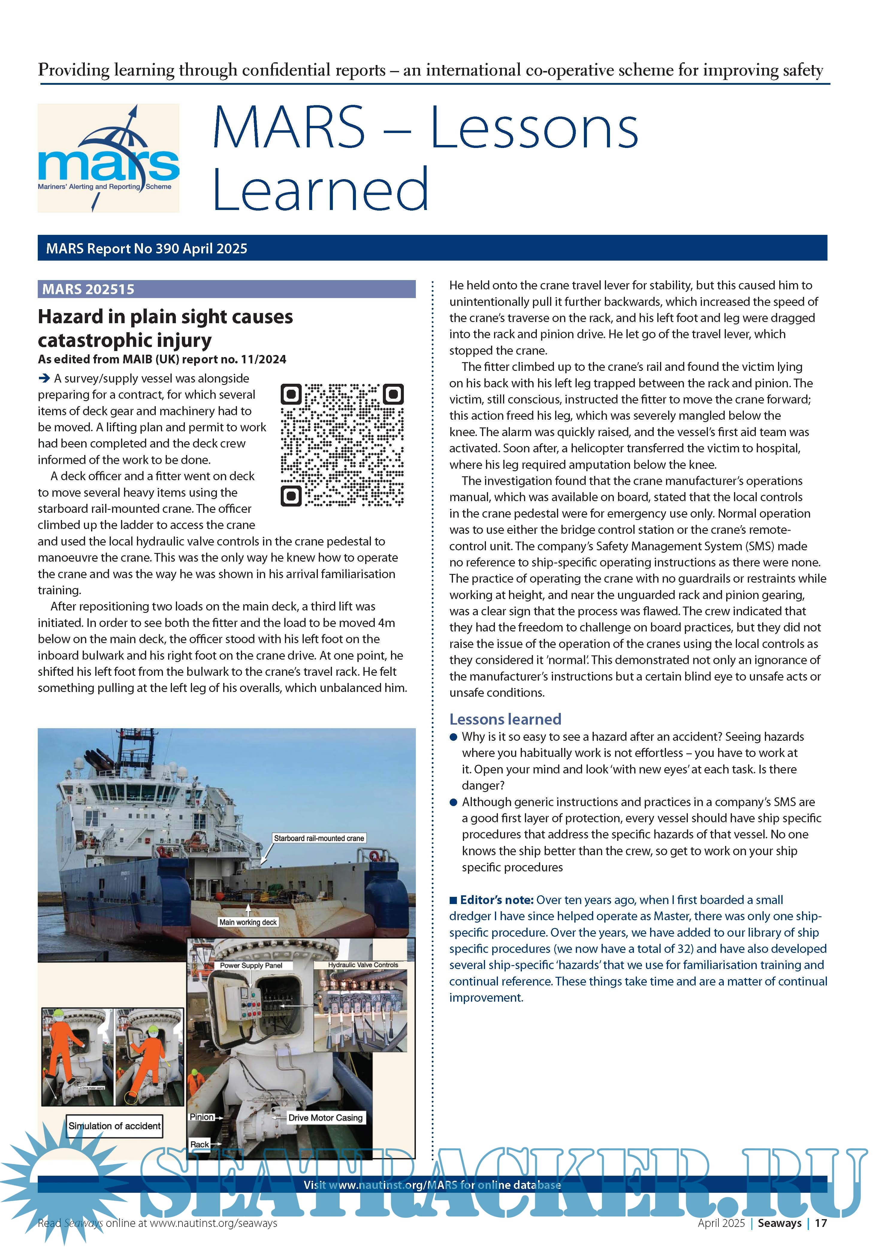 Year: The Nautica Language: English Author: The Nautical Institute Genre: Periodical publication Format: PDF Quality: eBook Pages count: 8 Description: Providing learning through confidential reports an international co-operative scheme for improving safety. MARS is a searchable database containing reports of accidents and near misses stretching back over a quarter of a century. Funded through the generous support of the Institute's Nautical Affiliate partners, it is one of the maritime industry's leading risk reduction initiatives and is helping to make life safer for seafarers everywhere