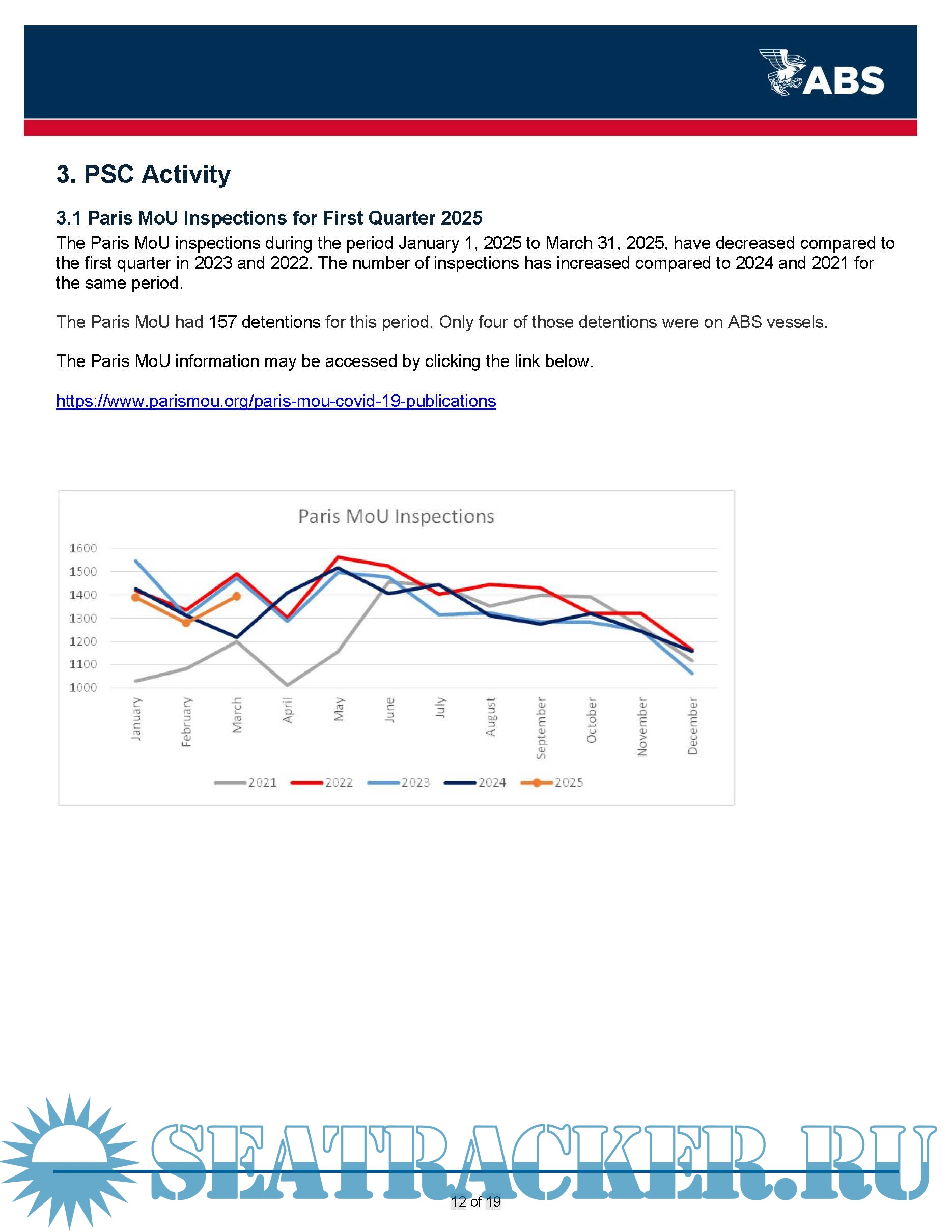 Year: 2025 Language: English Author: ABS Genre: Reference book Publisher: ABS Edition: 1st quarter of 2025 Format: PDF Quality: eBook Pages count: 19 Description: This ABS Quarterly Report on Port State Control (PSC) provides information to owners on deficiencies identified on ABS vessels during inspections carried out by the various PSC regimes globally during the 1st quarter of 2025. This reports are being made available to assist owners by providing awareness of potential areas of concern that have been identified on ABS classed vessels.