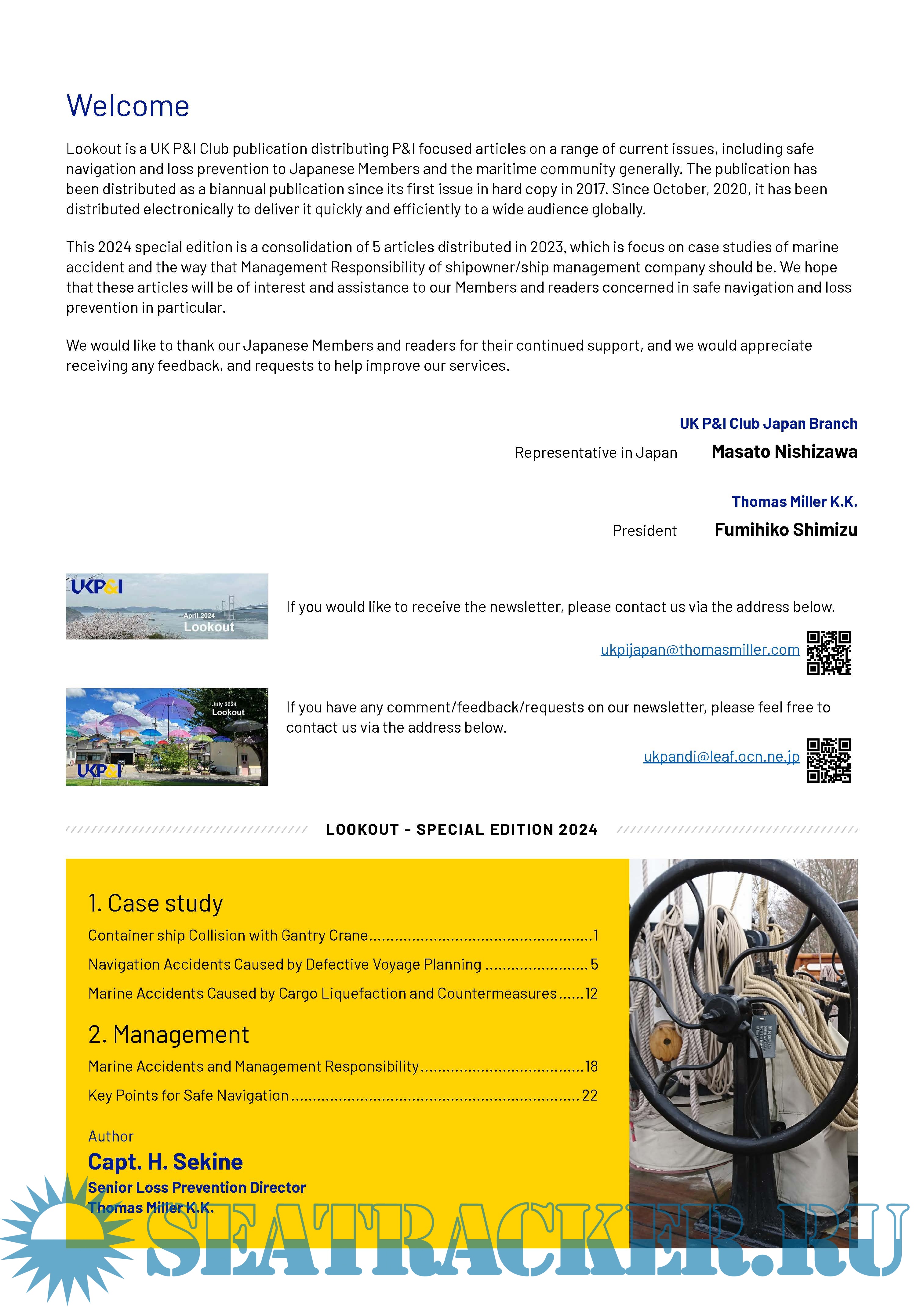 Year: 2024 Language: English Author: UK P&I Club Genre: Periodical publication, Bulletin Publisher: UK P&I Club Edition: 2024 Special Edition Format: PDF Quality: eBook Pages count: 27 Description: Lookout is a UK P&I Club publication distributing P&I focused articles on a range of current issues, including safe navigation and loss prevention to Japanese Members and the maritime community generally. The publication has been distributed as a biannual publication since its first issue in hard copy in 2017. Since October, 2020, it has been distributed electronically to deliver it quickly and efficiently to a wide audience globally. This 2024 special edition is a consolidation of 5 articles distributed in 2023, which is focus on case studies of marine accident and the way that Management Responsibility of shipowner/ship management company should be. We hope that these articles will be of interest and assistance to our Members and readers concerned in safe navigation and loss prevention in particular.