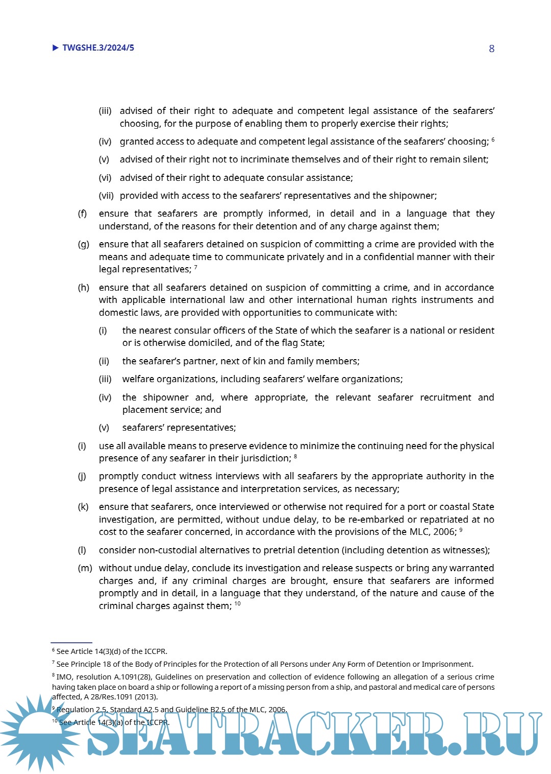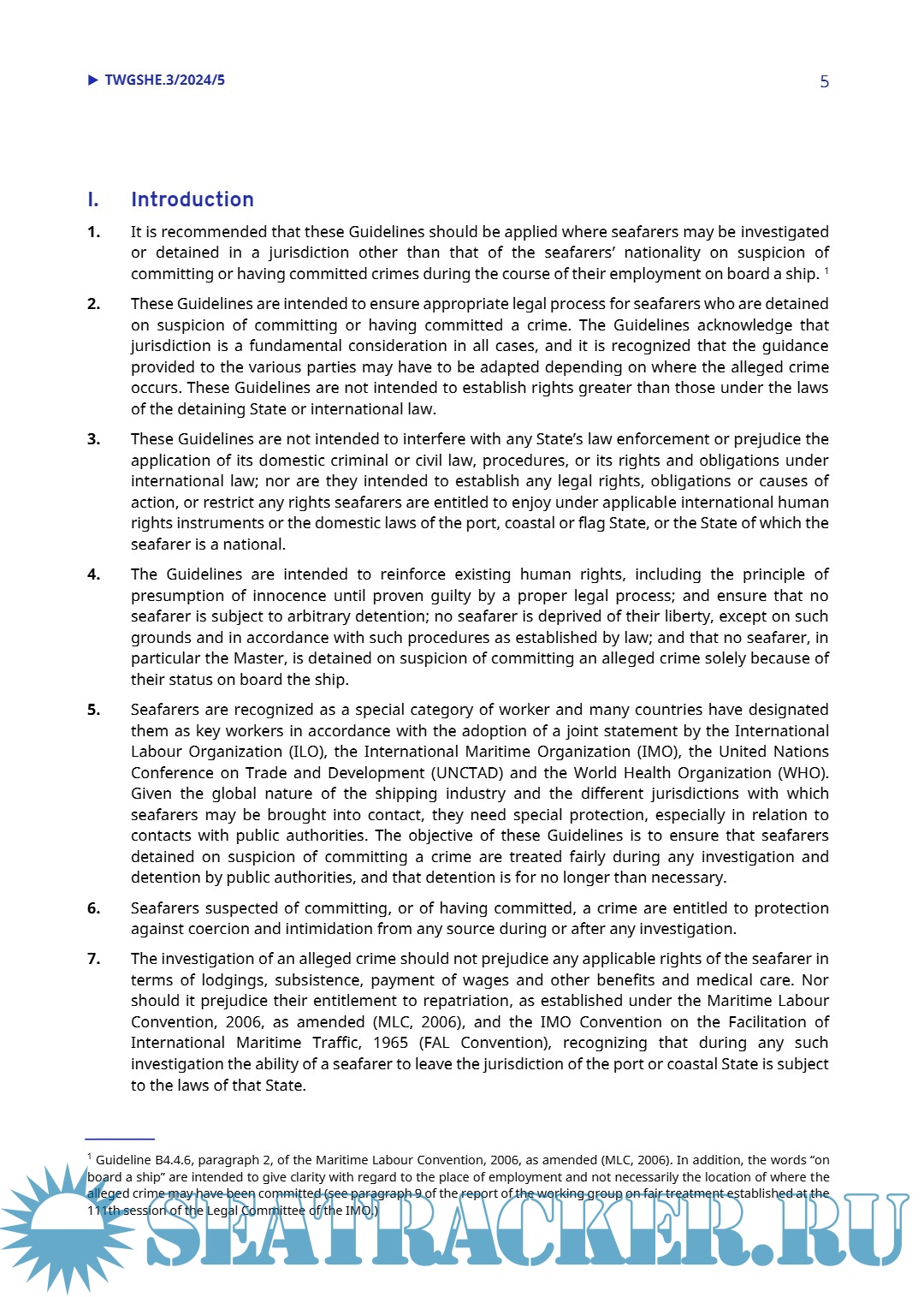 The Guidelines are based on, and to be read in line with, the principles, rights and obligations set out in the Maritime Labour Convention, 2006, as amended (MLC, 2006). The most relevant provisions of the MLC, 2006, and other international instruments relating to the fair treatment of seafarers detained on suspicion of committing crimes are set out in the appendix to the present Guidelines.
