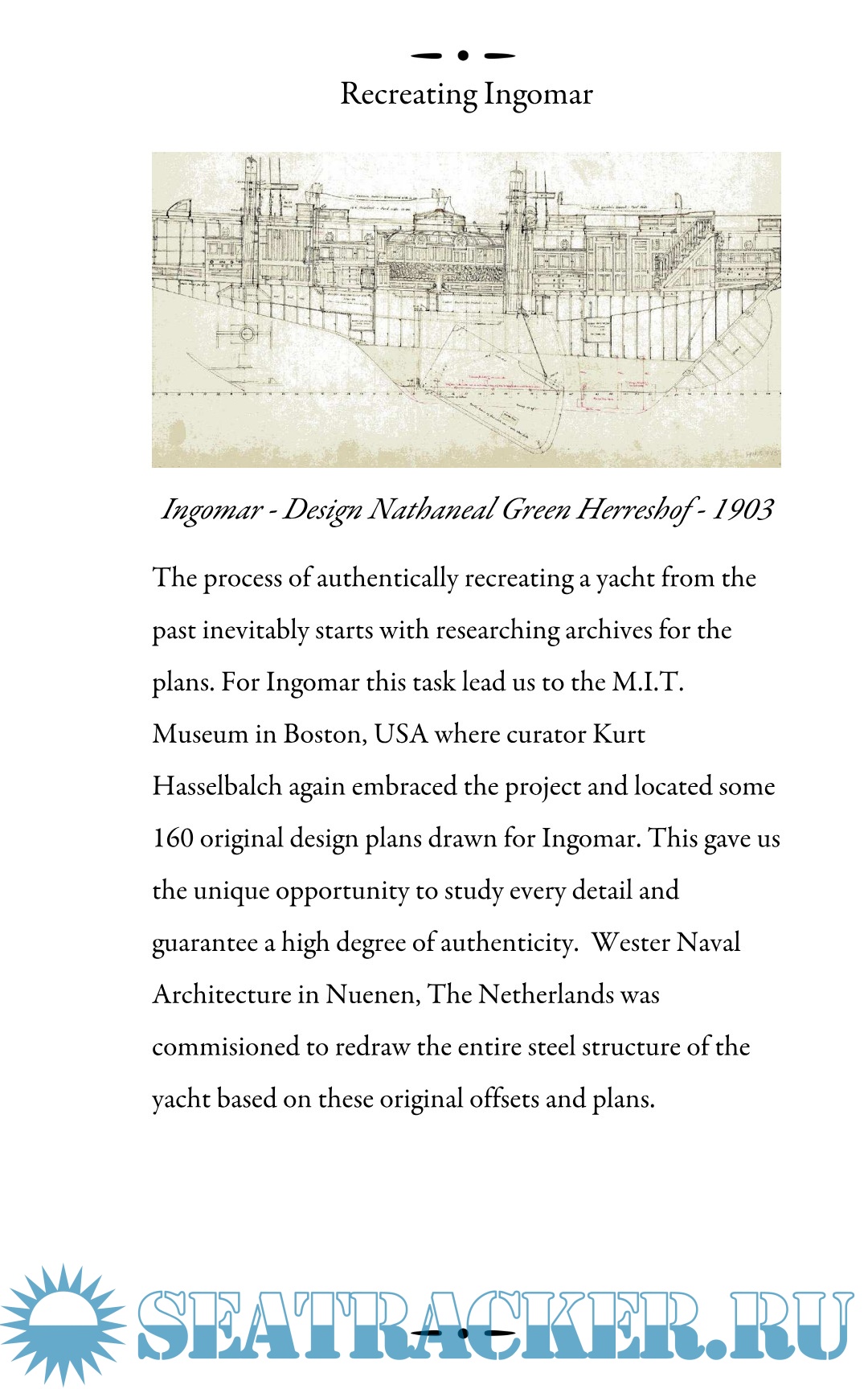 Description: ‘Ingomar’ was one of the first of the nine great Herreshoff (NGH) steel-hulled schooner yachts. She was designed and built the same year as ‘Reliance’ in 1903. Before ‘Ingomar’ all the big Herreshoff sailing yachts had been single-stickers, consisting mostly of the America’s Cup boats.