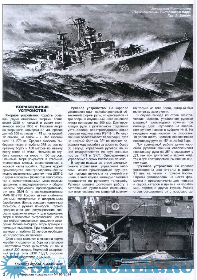Год выпуска: 2024 Язык: Русский Автор: Муратов В. Жанр: Периодическое издание (журнал) Издательство: Моделист-Конструктор Издание: Морская коллекция 2024-05 (296) Формат: PDF Качество: Отсканированные страницы Количество страниц: 36 Описание: Якорное устройство. Корабль оснащен двумя становыми якорями Холла весом 2250 кг каждый и одним стоп-анкером весом 1000 кг. Носовые якоря на якорь-цепи калибром 37 мм, правая длиной 300 м, левая - 175 м, на правой 12 смычек, на левой - 7. Вес якорной цепи 14 270 кг. Средняя скорость выбирания якоря с глубины 275 метров по правому борту и 150 метров по левому борту около 18 м/мин. Нормальная глубина стоянки на якоре - 100 метров. Становые якоря убираются в стальные утопленные клюзы, расположенные в носовой части корабля. Подъем якорей производится электрогидравлическим якорно-швартовным шпилем типа ШЭГ-2 с двумя головками (правого и левого борта) с самостоятельными механизмами вращения, и гидродвигателями и общим насосом переменной производительности типа ЭМН 9/1 с электродвигателем МАФ 92-91/8. Головки шпиля снабжены цепными звездочками и швартовными барабанами. Шпиль оснащен ленточным тормозом с ручным приводом. Тормоз предназначен для регулирования скорости травления якоря и для удержания якоря с полностью вытравленной цепью при любом направлении вращения звездочки. Можно выбирать якорь вручную с помощью вымбовок. При подъеме якоря вручную с глубины 25 метров необходимо 17 работающих человек.