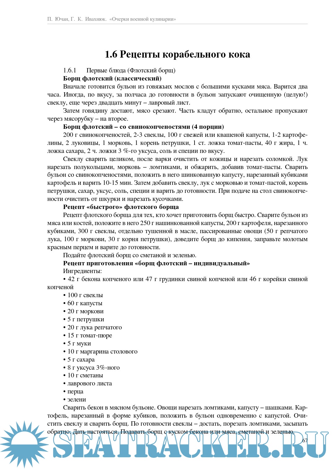 Описание: В книге приводятся уникальные сведения по истории организации продовольственного обеспечения Военно-морского флота, Военно-воздушных сил, а также Сухопутных войск нашей страны. Кратко охарактеризованы технические особенности камбузного оборудования, полевых кухонь, опреснительных установок и агрегатов для термического обезвреживания отходов. Приводятся физиологически обоснованные рецепты рационального питания для военнослужащих ВС РФ.
