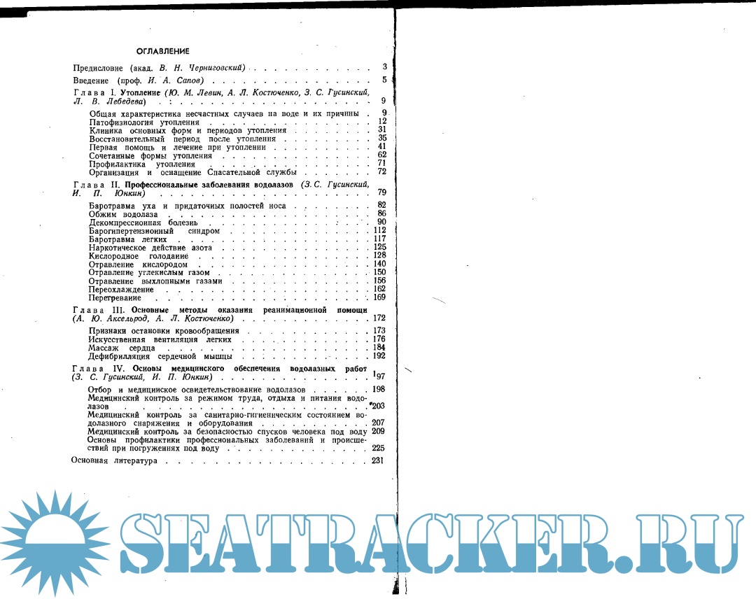 Год выпуска: 1980 Язык: Русский Автор: Сапов И.А., Шанин Ю.Н. Жанр: Руководство Издательство: Л.: Медицина Формат: PDF Качество: Отсканированные страницы Количество страниц: 124 Описание: В книге содержится систематическое изложение этиологии, патогенеза, клиники, первой помощи, лечения и профилактики утопления и профессиональных заболеваний водолазов. Наиболее подробно представлены материалы по утоплению как основному патологическому состоянию у находящихся на воде людей и наиболее грозному осложнению профессиональных заболевании водолазов. Приведены основные методы оказания реанимационной помощи. Изложены основы медицинского обеспечения водолазных спусков и работ. Пособие предназначено для медицинских работников и всего персонала Спасательной службы, ведомств и организаций, выполняющих водолазные и кессонные работы, а также проводящих спортивные мероприятия на воде. Оно может быть полезным для клиницистов различного профиля, врачей-профпатологов, специалистов по оксигенобаротерапии и для широкого круга любителей подводного спорта и водолазов.