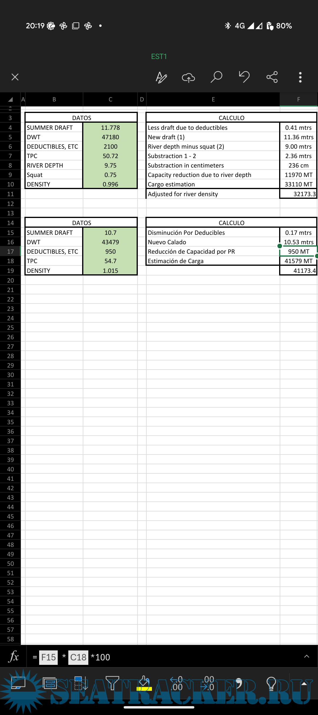 Hi I corrected your second for sea anchorage where in Reducción de Capacidad por PR should be 950 and reflected as per TPC Refer to screenshots All is good for fast calculations but having hydrostatic table is better. If you are working on general or bulk carriers then see my post on Draft survey and trimming program. That might help you if i have your vessel in my database.