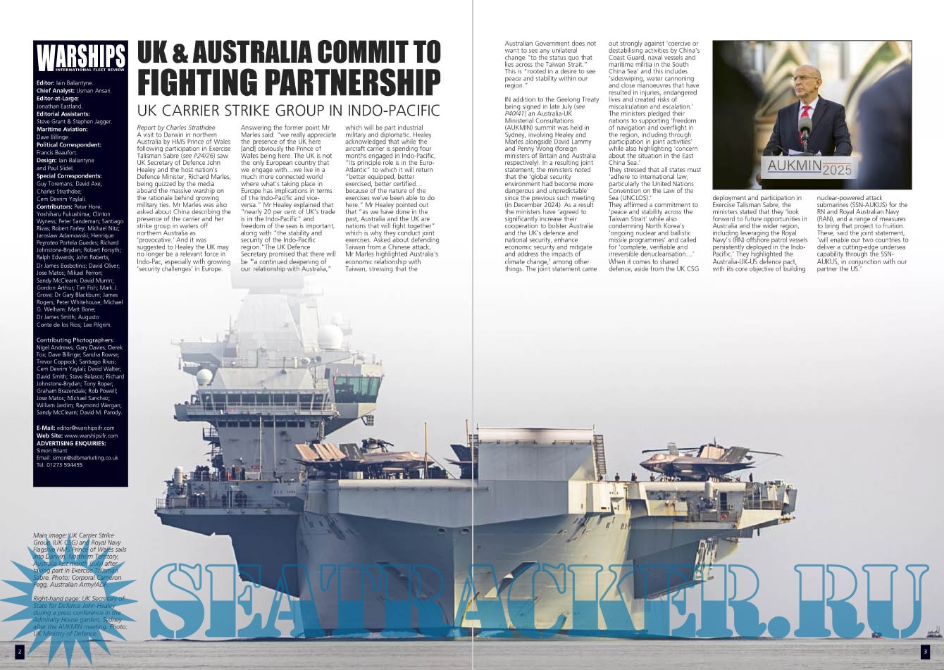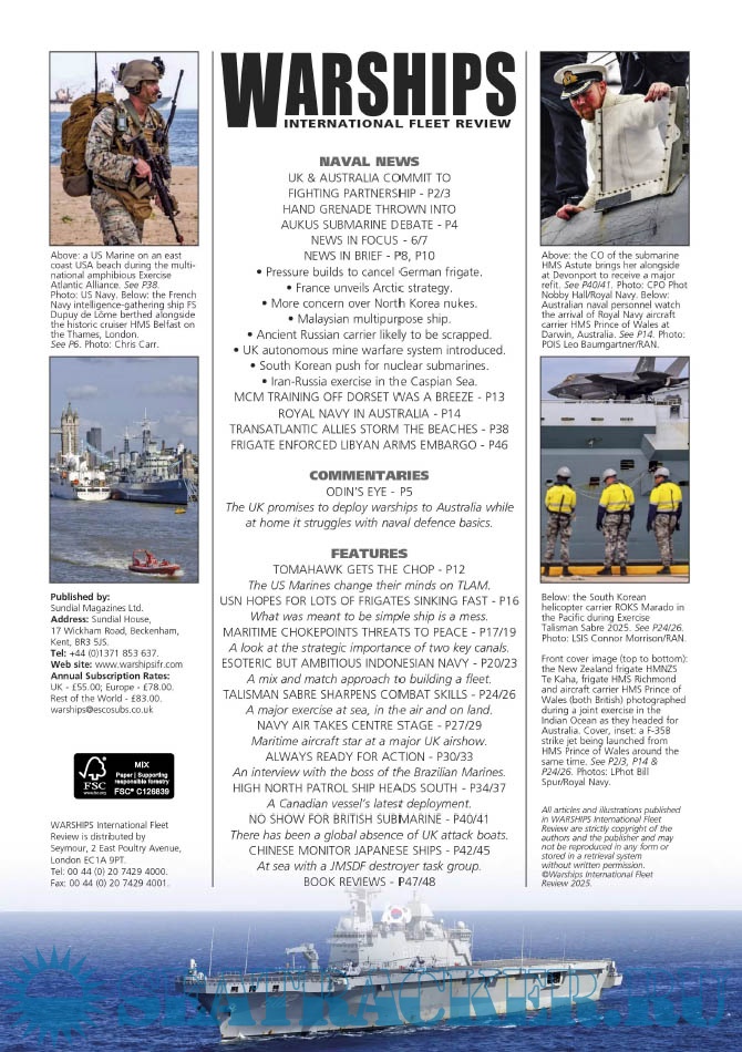 Description: Warships IFR puts the spotlight on the latest developments in the world’s navies. It covers current defence issues and has comments by leading analysts. The magazine regularly includes features on the Royal Navy and the US Navy in addition to incorporating news and features on all other navies across the globe. Warships IFR frequently carries in-depth articles on naval heritage.WARSHIPS International Fleet Review is published 12 times a year by Tandy Media Ltd who also publish Shipping Today & Yesterday (which provides news and features from the world of merchant shipping).