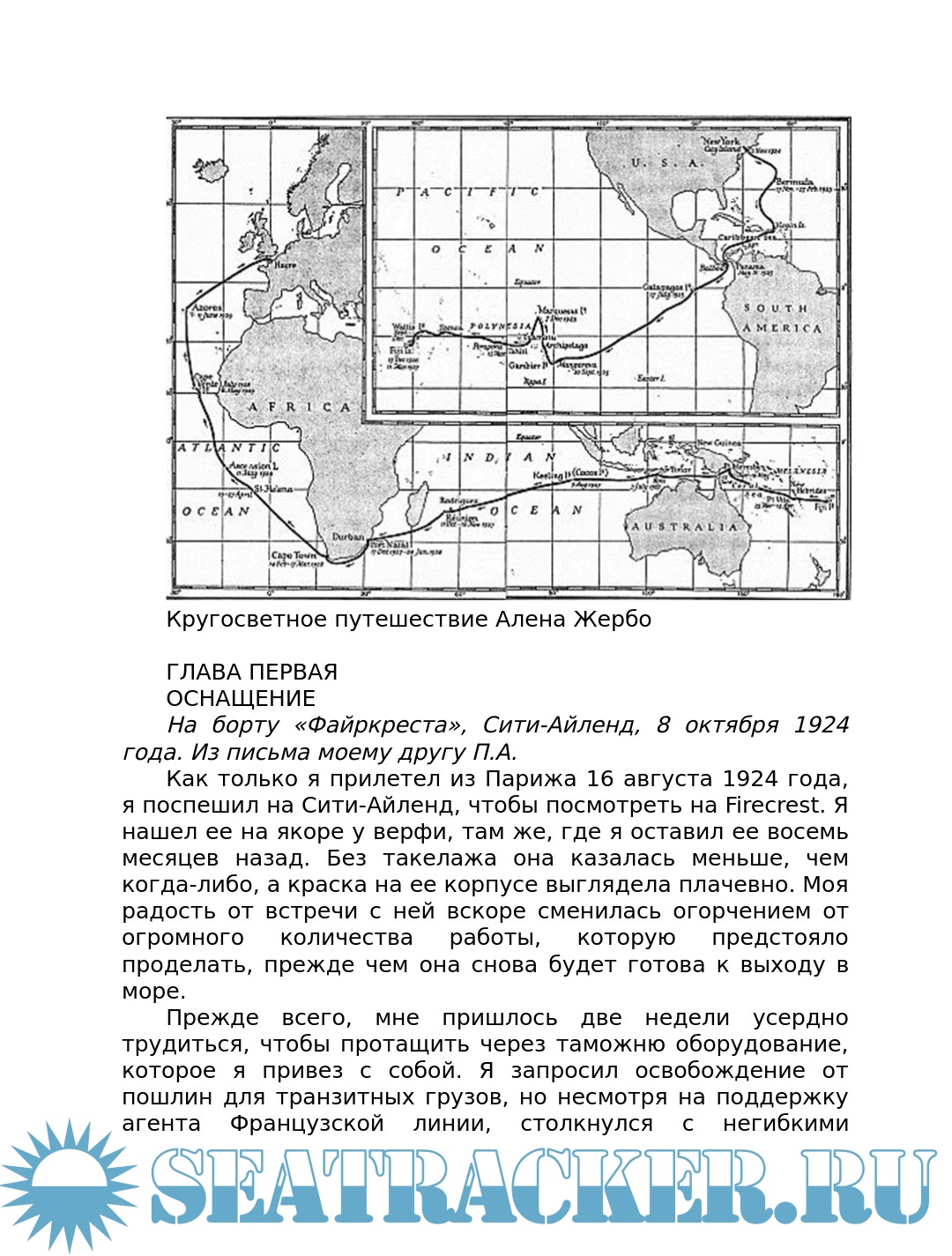 Описание: Ален Жербо (1893-1941) французский моряк, писатель и чемпион по теннису, совершивший кругосветное плавание в одиночку. В конце концов он осел на островах южной части Тихого океана, где написал несколько книг об образе жизни островитян. В книге «In quest of the sun» (В поисках солнца) описывается дальнейшее кругосветное одиночное плавание автора на яхте «Файркрест» из Нью-Йорка через Панамский канал, Тихий океан и Полинезию, Арафурское море, Индийский океан, мыс Доброй Надежды и Атлантику в Гавр (Франция) в 1924 - 1929 годах. Всего в этом плавании было проведено 700 дней в море и пройдено более 40000 миль.