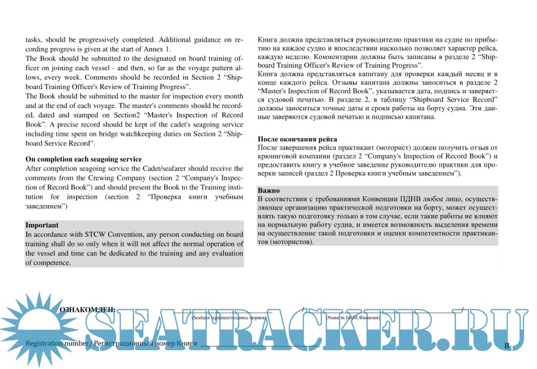 Год выпуска: 2015 Язык: Русский, Английский Автор: А. Л. Боран-Кешишьян Жанр: Книга регистрации Издательство: НГМА Формат: PDF Качество: Отсканированные страницы Количество страниц: 87 Описание: Эта книга предназначена для подготовки морских специалистов к получению квалификационных свидетельств по стандартам Международной конвенции STCW 1978 с поправками. Она охватывает требования к матросам-мотористам, несущим вахту в машинном отделении или выполняющим обязанности на периодически необслуживаемых судах, а также к мотористам первого класса. Особое внимание уделяется практическому обучению на борту: ведению Книги регистрации практики, выполнению задач под наблюдением офицеров, подтверждению компетентности и безопасной работе с механизмами судна. Подробно рассмотрены обязательные и дополнительные навыки, включая работу с насосными системами, электроустановками, техническое обслуживание и размещение грузов. Книга обеспечивает систематическую программу обучения, контроль прогресса и соответствует требованиям российских и международных правил, помогая кадетам и морякам приобрести практический опыт и профессиональные навыки для успешной сертификации и безопасной службы на судне.