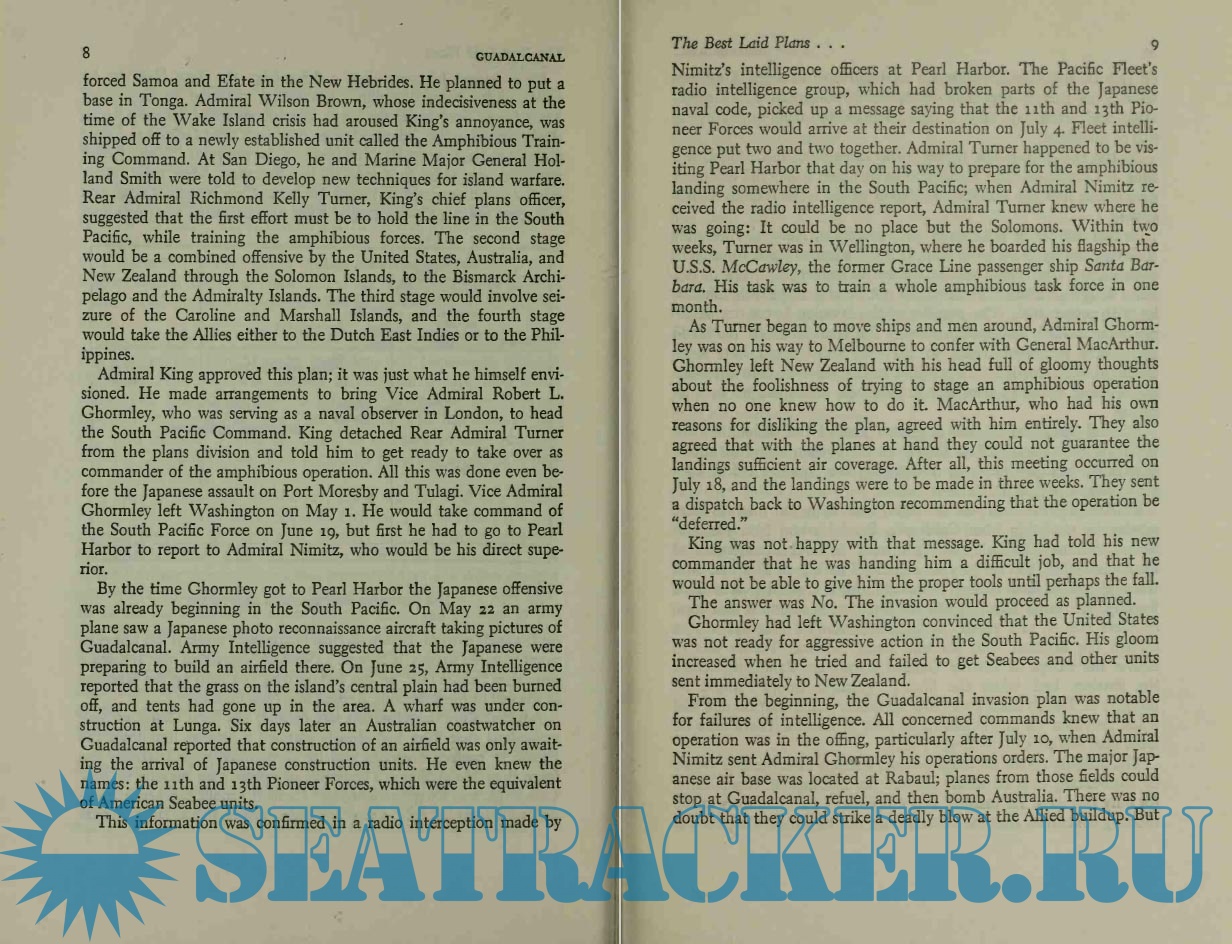 Description: Guadalcanal was the first major American offensive confrontation with the Japanese in the Pacific war. Until then, the entire American effort had been defensive, including the Battle of Midway. The American fleet was still scanty in the summer of 1942, and Admiral Nimitz did not contemplate offensive action for perhaps another year. His plans were reversed when the Japanese decided to land a force on Tulagi and build an airfield on Guadalcanal Island, from which they could dominate the shipping lanes between America and Australia.
