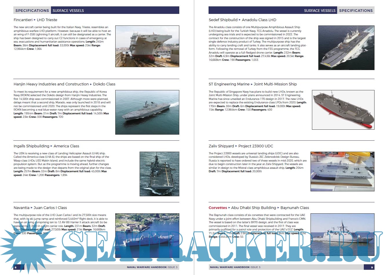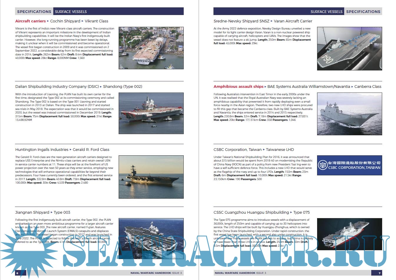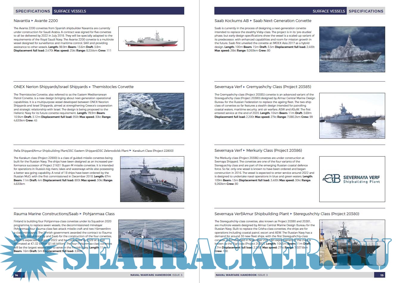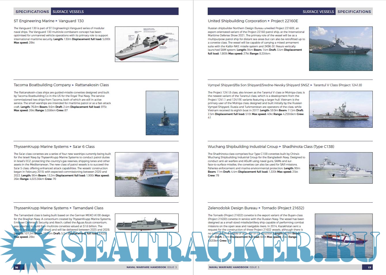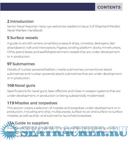 Year: 2022 Language: English Author: The Shephard Press Genre: Encyclopedia Publisher: The Shephard Press Format: PDF Quality: eBook Pages count: 172 Description: This section covers surface ships that are currently in production or in development around the world. It is divided into the following categories: • aircraft carriers • amphibious assault • corvettes • destroyers • fast attack/patrol craft and interceptors • frigates • landing platform docks • minehunters • OPVs • patrol boats • sealift/replenishment vessels Entries are arranged alphabetically by manufacturer and vessel class. The specifications are those supplied by the builders.
