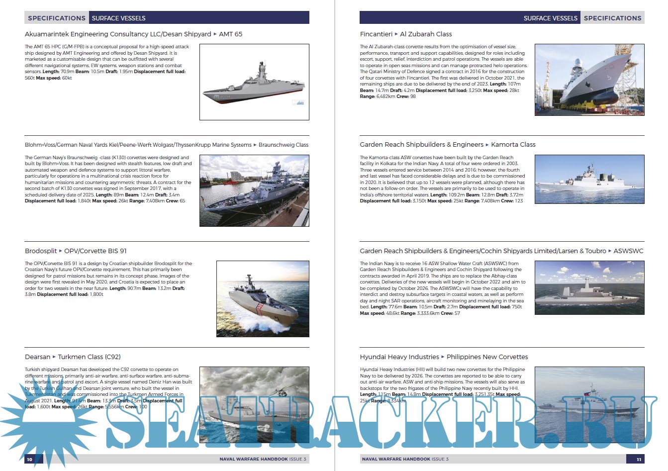 Entries are arranged alphabetically by manufacturer and vessel class. The specifications