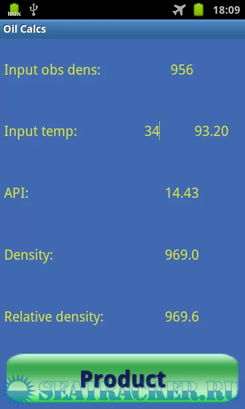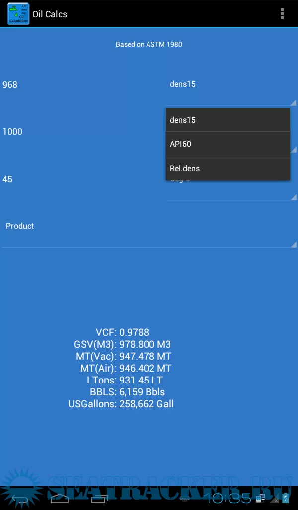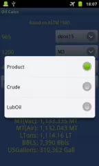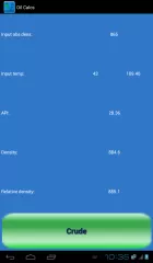 The app can calculate for crude oil, black and white products and lubrication oils, and input can be changed between density in vacuum / API, M3 and Barrels, and degrees Celsius / Fahrenheit.