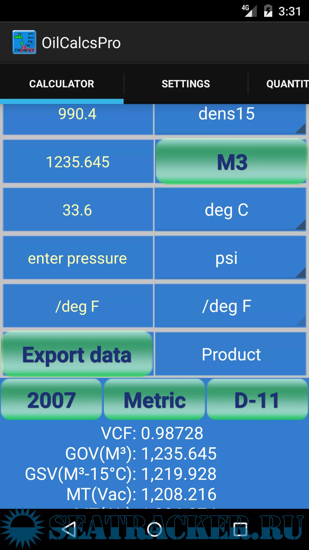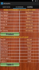 The app can calculate for crude oil, black and white products, lubrication oils and special applications, and input can be changed between density in vacuum at 15 and 20 deg C/ API / relative density / observed density, and degrees Celsius / Fahrenheit by touching the applicable buttons. Also when using 2004 tables, the input of pressure is enabled and can be switched between psi, kPa and Bar.