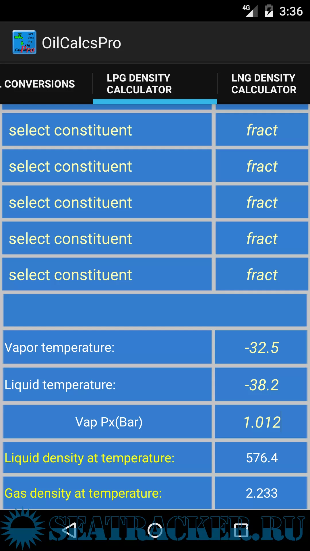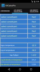 Aside from the conversion screen with conversions between API, observed density, density 15, density 20 and relative density for petroleum products/Crude Oil and Lubrication Oil, there is also a screen with conversions used in LPG / NGL, as well as an LPG density calculator.