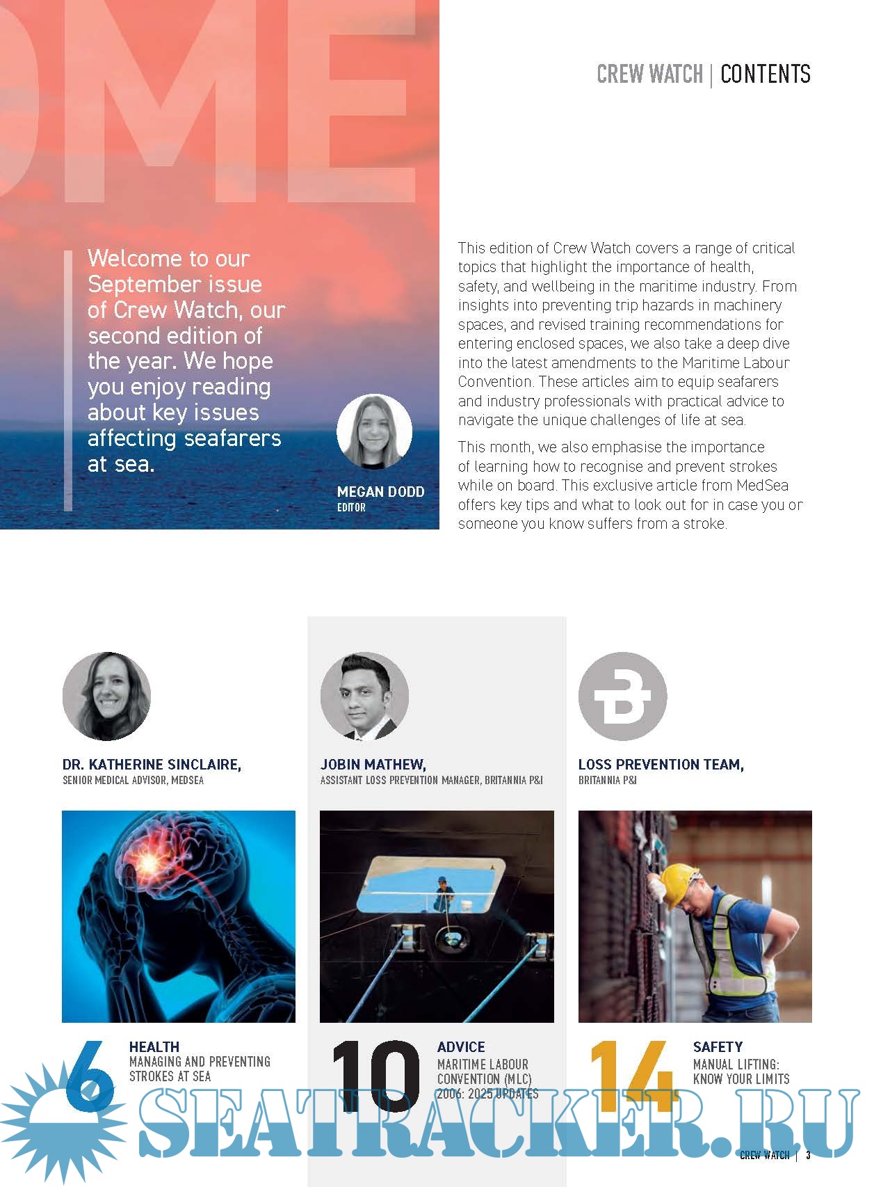 September 2025’s Crew Watch highlights safety, health, and wellbeing, including trip hazards in machinery spaces, key amendments to the Maritime Labour Convention (MLC) 2006, stroke prevention at sea, galley hygiene, manual lifting advice and updated enclosed space entry training.