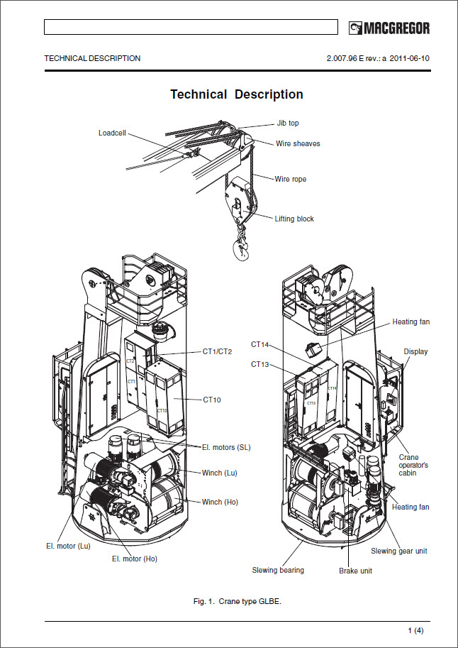 1. Elevation of persons. 2. Exposing persons to the risks of falling cargo. 3. Overloading. 4. Unlocking the crane or crane jib or operating the equipment at sea without full acceptance and control of personnel and equipment safety. 5. Unprofessional, intended or unintended, adjustment of safety locks, hydraulic or electric adjustments. 6. Disregard of occupational and safety standards of work. Functions, Installations and Equipment General The MacGregor crane has built-in safety functions and installations to allow for safe normal use, operation, care, and control. This is applicable to instructed personnel without specific professional education or certification, but working according to this manual. Specific service and repair of the electrical, hydraulic and the mechanical functions, controls and adjustments require professional service personnel knowledgeable of risks involved. Regular Care and Control (Maintenance) This manual contains checklists for regular care and control of crane equipment, wire ropes and hydraulic filters. These checklists routine contain inspections and maintenance regularly prescribed for safe function, e.g.: Chapter 4 contains: Safety Precautions Checklist for Single and Twin Cranes. Chapter 5 contains, if applicable: Inspection of Stressed Components and Structures. Electrical chart,Crane. Lubrication chart; Crane. Lubrication chart; Cable Winch and Stabilizing Equipment. Lubrication chart; Power Swivel. Filters. Before maintenance and service work is started, cer- tain measures and procedures must be obeyed. Chapter 6 contains: Measures before Starting Service/Maintenance Work. Handling, Installation and Maintenance of Steel Wire Ropes. Examine the brake adjustments. (Valid for winches which have electric motors.) Electric Motors, Electrical Equipment, General Maintenance. Safety Functions and Equipment Specific safety equipment is installed and delivered with this crane and must be available for its intended use. The owner/operator of the ship and its equipment is responsible to make that safety functions, installations and equipment are maintained to operational standards and are not being removed, by-passed or worn to non-working condition. This manual features important presentations of safety functions, installations and equipment. A summary is presented below. 1. Safety Functions a. Manoeuvring functions: 1. All the crane’s working functions are stopped and the brakes will automatically operate when the emergency stop button is pressed. The button is loacated in cabin. This action operates the safety stops and automatic lock positions. 2. The crane has several fail-safe functions to overrule or stop the operator’s manoeuvring in the event that the normal electrical or hydraulic functions fail, a sudden uncontrolled movement occurs or during uncontrolled speed operation (see below). 3. There are limits for hoisting/lowering and luffing outreaches, which are controlled by software limits which monitors the encoders' position in the limit switch box. 4. AutoLaodstep, stop limits and speed reduce for load-dependent outreach are controlled by the software. 5. Safety cams are mechanical stop limits for hoisting, full/empty drum and luffing min/max GENERAL 1.000.6 E rev.:b 2011-12-07 outreaches, if there is a failure in the software. 6. A check cam in the centre of the working range of hoisting/lowering motion and luffing outreaches, are used to verify the function of the encoders' position. b. Hydraulic functions: 1. Hydraulic valve functions are adjusted for exact pressure. Any change in the adjustments adversely affects the crane operation and must exclusively be adjusted by MacGregor supervisor (see instructions Hydraulic function). 2. In case of a ruptured control pressure the oil pipe/hose or other control pressure drops, the oil control pressure will collapse. If the control pressure decreases the pump automatically starts and the control pressure increases. 3. Each winch has an electric motor flanged to the drive in complete. The hydraulic operated multi-disc brakes provide braking of the winch. The winches have one brake each. 4. An electric motor is flanged to each slewing gear and provides hydraulic operated multi-disc brake of the slewing gears. The slewing gears have one brake each. 5. If there is a multi-disc brake failure of the parking brake, caused by worn out brake discs, sticking cylinder, brake pilot valve or valve spool, the function of regenerative braking through the electric motor by the winches and slewing gears is still available. Push the Start/Stop pushbutton position "0" and the system awaits the activating of the brakes and the crane then stops. 6. In case of overheating oil in the hydraulic system, or oil level drops below the minimum permissible level the crane stops and the multi-disc brakes are applied. 7. Efficient oil filters with exclusive bypass to the hydraulic oil tank protect the system from harmful oil conditions. Dirty filter might cause malfunction to the system. c. Electrical functions: 1. The crane control system CC3000, adjusts the crane outreach to suit each load. The load is weighed by a loadcell and the outreach is measured using an angle encoder. CC3000 receives information about the torque of the electric motor from each frequency converter and is used to measure whether the value of the loadcell is correct. See also "Crane Control System CC3000" in section 3 . 2. During a complete power failure all solenoid valves are de-energized and all multi-disc brakes will be applied. 3. The electronic cabinets have power failure indicators. This function closes the electronic signals down which automatically applies all multi-disc brakes. 4. The heat sensors in the electric motors stop the operation that is working, i.e. luffing, hoisting or slewing, and apply all multi-disc brakes. If the electric motor is about to overheat temperature switch (klixon) ramps down each movement, luffing, hoisting or slewing oper