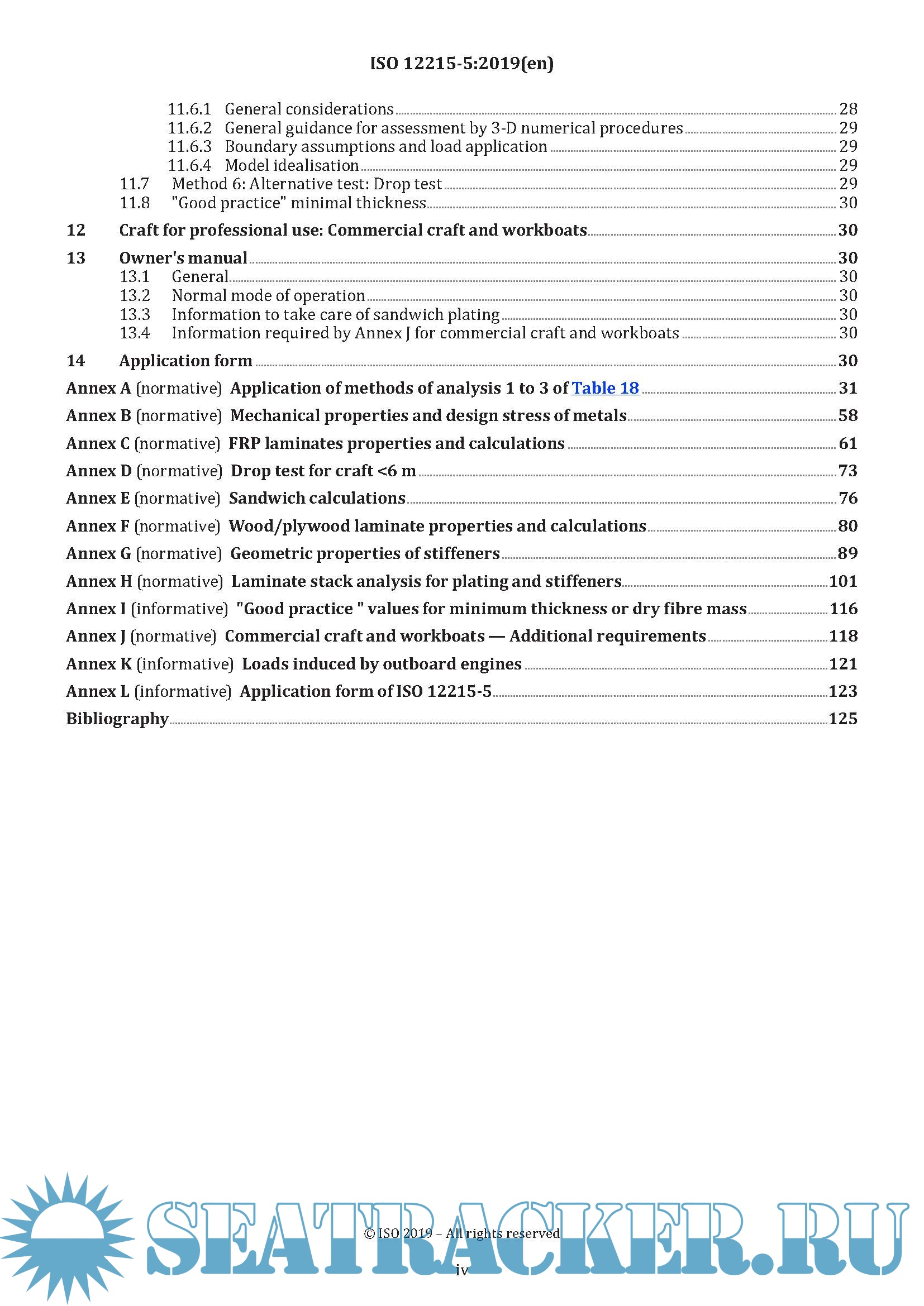 Year: 2024 Language: English Author: ISO Genre: Нормативный документ Publisher: ISO Edition: 2nd edition / Corrected version Format: PDF Quality: eBook Number of pages: 136 Description: The committee responsible for this document is ISO/TC 188, Small craft. This second edition cancels and replaces the first edition (ISO 12215-5:2008, including its amendment ISO 12215-5:2008/Amd 1:2014), which has been technically revised. One of the main reasons to achieve this revision, after a decade implementing the first edition, was to allow other scantlings calculation methods than those given in the 2008 edition, noting the huge development of finite element analysis methods and software, and the trend already applied in ISO 12215-9 (keels and appendages) and ISO 12215-7 (multihulls). Therefore, in this new edition, like in many other scantlings standards, the design pressure loads, and the design stresses are given in the main body of the standard and, where needed, the scantlings calculation methods are detailed in Annexes. The main changes compared to the previous edition are as follows: — clarification of the scope and of many definitions, dimensions, and assessment; — definition of a theoretical hull/deck limit height ZSDT in Table 3; — renaming of nGC into kDYN in Table 7; — lowering of the values of kL in the aft part of the craft in Table 8; — deletion of kAR min, to better consider large panels, mainly sandwiches, in Table 9; — improvement of the values of kSUP in Table 10; — modification of design pressures for motor and sailing craft in Tables 12 & 13; — modification of design stresses introducing kBB and kAM factors in Tables 15 to 17; — incorporation of requirements for work boats in Table 2, Clause 12 and Annex J; — possibility to use a wider range of assessment methods detailed in Table 18; — move of the previous assessment method (now called "simplified") in Annex A; Additional info: This document defines the dimensions, design local pressures, mechanical properties and design stresses for the scantlings determination of monohull small craft with a hull length (LH) or a load line length (see NOTE 1) of up to 24 m. It considers all parts of the craft that are assumed to be watertight or weathertight when assessing stability, freeboard and buoyancy in accordance with ISO 12217.