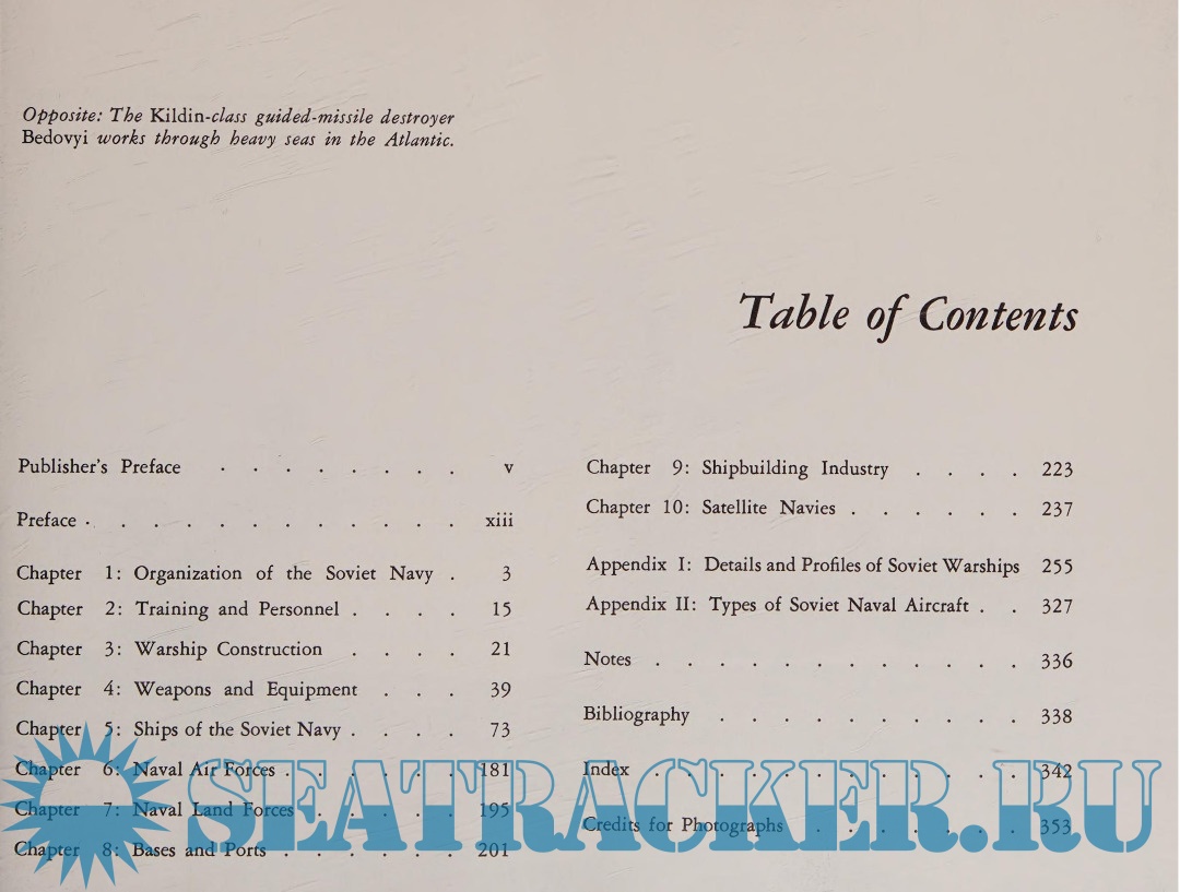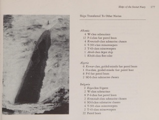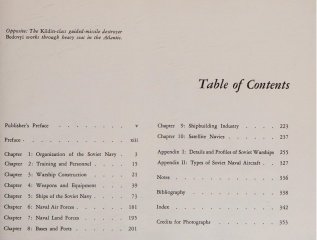 The section on details and profiles of Soviet warships is probably the most complete record that anyone outside the Soviet Union (and a few intelligence agencies) could construct. It contains profiles of all the ship types and classes, from the helicopter carrier Moskva, through nuclear-powered submarines and missile-range instrumentation ships, to seagoing tugs.