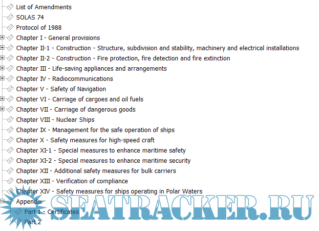 List of Amendments SOLAS 74 Protocol of 1988 Chapter I General provisions Chapter II-1 Construction – Structure, subdivision and stability, machinery and electrical installations Chapter II-2 Construction – Fire protection, fire detection and fire extinction Chapter III Life-saving appliances and arrangements Chapter IV Radiocommunications Chapter V Safety of navigation Chapter VI Carriage of cargoes and oil fuels Chapter VII Carriage of dangerous goods Chapter VIII Nuclear ships Chapter IX Management for the safe operation of ships Chapter X Safety measures for high-speed craft Chapter XI-1 Special measures to enhance maritime safety Chapter XI-2 Special measures to enhance maritime security Chapter XII Additional safety measures for bulk carriers Appendix Certificates Part 1 - Certificates Part 2