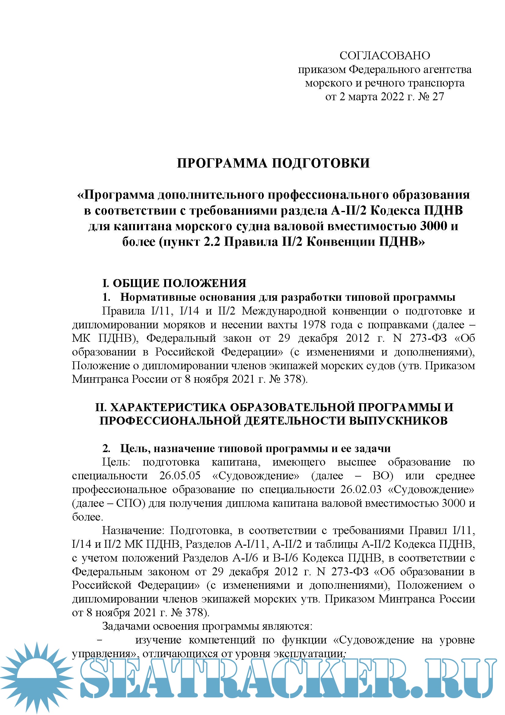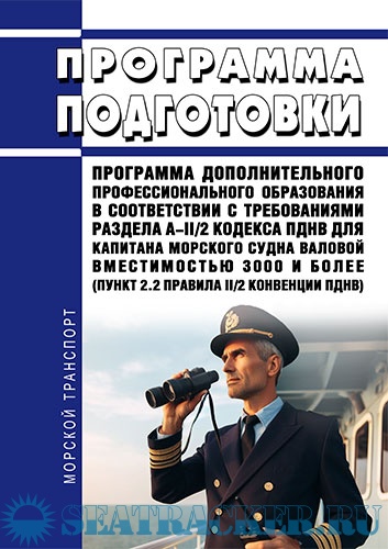 Описание: Программа подготовки "Программа дополнительного профессионального образования в соответствии с требованиями раздела А-II/2 Кодекса ПДНВ для капитана морского судна валовой вместимостью 3000 и более (пункт 2.2 Правила II/2 Конвенции ПДНВ)" согласована приказом Федерального агентства морского и речного транспорта от 2 марта 2022 г. № 27.