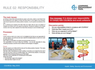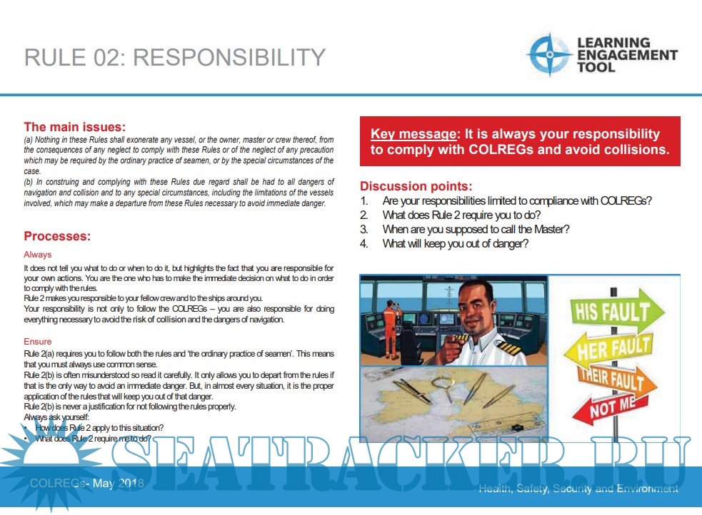 Year: 2018 Language: English Author: Learning Engagement Tool Genre: Marine Navigation and Safety of Sea Transportation Format: PDF, PPTx Quality: Photos of pages Pages count: 33 Description: This Engagement Pack IS NOT to be used for skills training or a task requiring a licensed operator. This IS NOT a tool box talk. This is an opportunity for staff on board to talk about safety without feeling rushed to commence their work. The rate of learning is more important than completing the pack so allow two or more sessions if necessar Additional info: For the use of vessel crews and all those who are involved in marine operations.