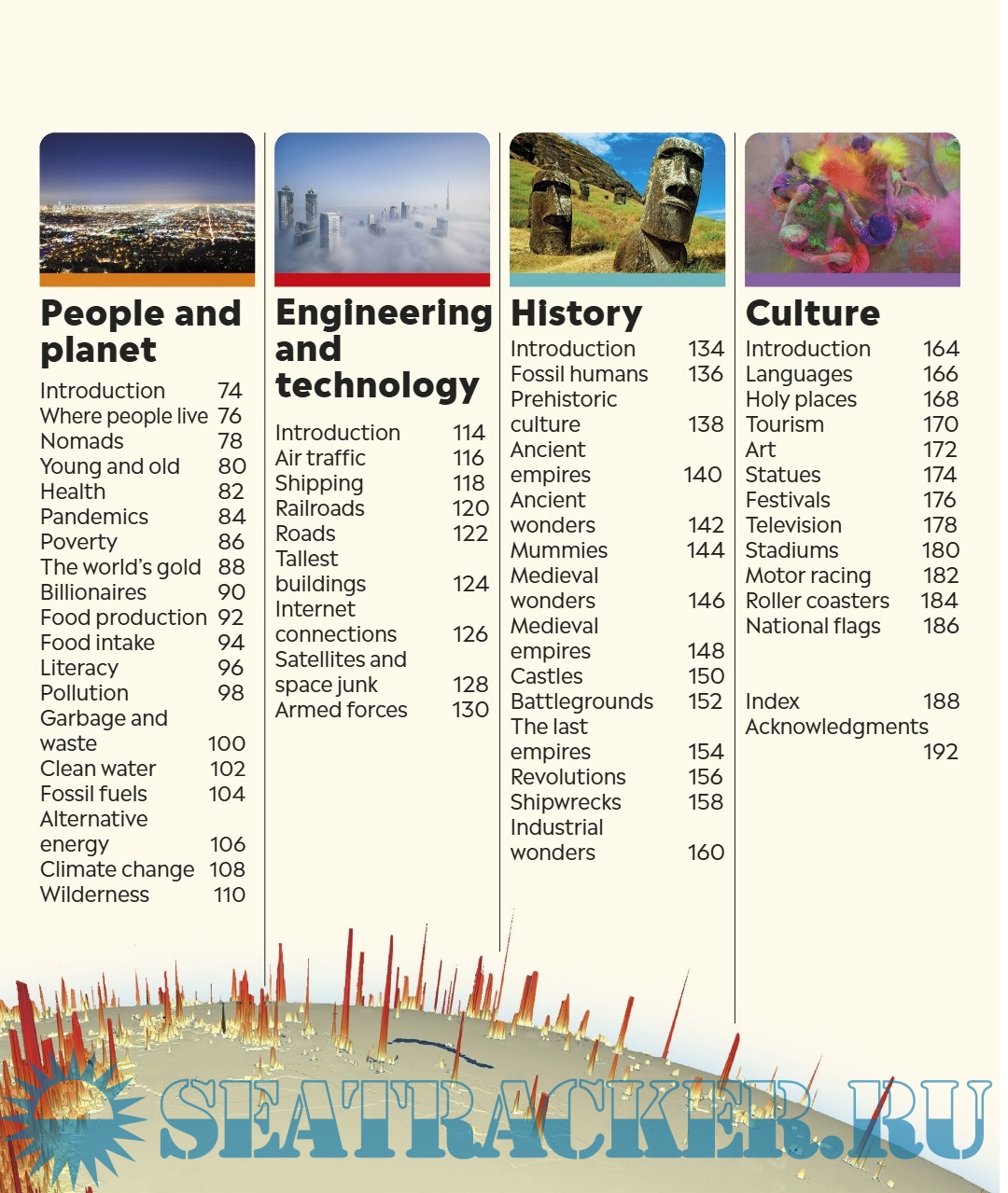 Climb the tallest buildings, swim the longest rivers, dive to underwater shipwrecks, and meet the deadliest creatures. Answer thousands of curious questions like "Where are the most explosive volcanoes?" or "Where do the world's billionaires live?". With over 60 specially commissioned 3D maps, the book covers animals, natural disasters, engineering, history, and culture.