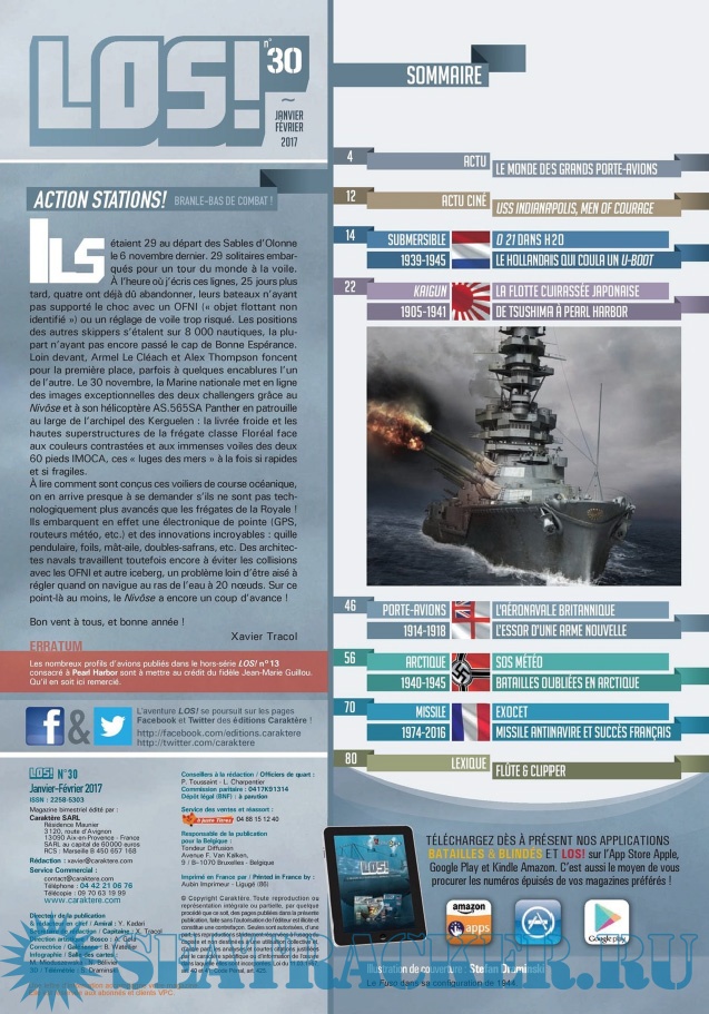 Year: 2017 Language: French Author: Collective Genre: Periodical publication Edition: 2017 01-02 Format: PDF Quality: eBook Pages count: 84 Description: LES ÉDITIONS CARAKTÈRE PRENNENT LE LARGE EN LANÇANT UN NOUVEAU MAGAZINE CONSACRÉ À LA GUERRE NAVALE !Les sujets passionnants ne manquent pas et LOS ! met un point d’honneur à les présenter au lecteur comme cela n’a jamais été fait dans la presse française jusqu’à présent. Un seul mot d’ordre pour l’équipe rédactionnelle : rigueur scientifique et présentation ludique !S’appuyant sur un fond photographique d’exception, sur des plans de bateaux et d’avions, les éditions Caraktère innovent une fois de plus en vous proposant aussi des vues 3D détaillées, le tout au service de textes soigneusement rédigés par des auteurs spécialisés. Vous comprendrez ainsi comment fonctionne un submersible, comment se déroule un combat naval, comment est conçu un cuirassé ou comment attaquent les avions-torpilleurs !Revivez au fil des pages l’aventure humaine exceptionnelle des matelots de la marine marchande affrontant les U-Boote en Arctique, ou celle des pilotes embarqués sur les porte-avions américains et japonais. Lisez les exploits des hommes-grenouilles italiens en Méditerranée, des équipages des vedettes lance-torpilles dans la Manche, des sous-marins soviétiques de la guerre froide ou des grands cuirassés de 1914-18