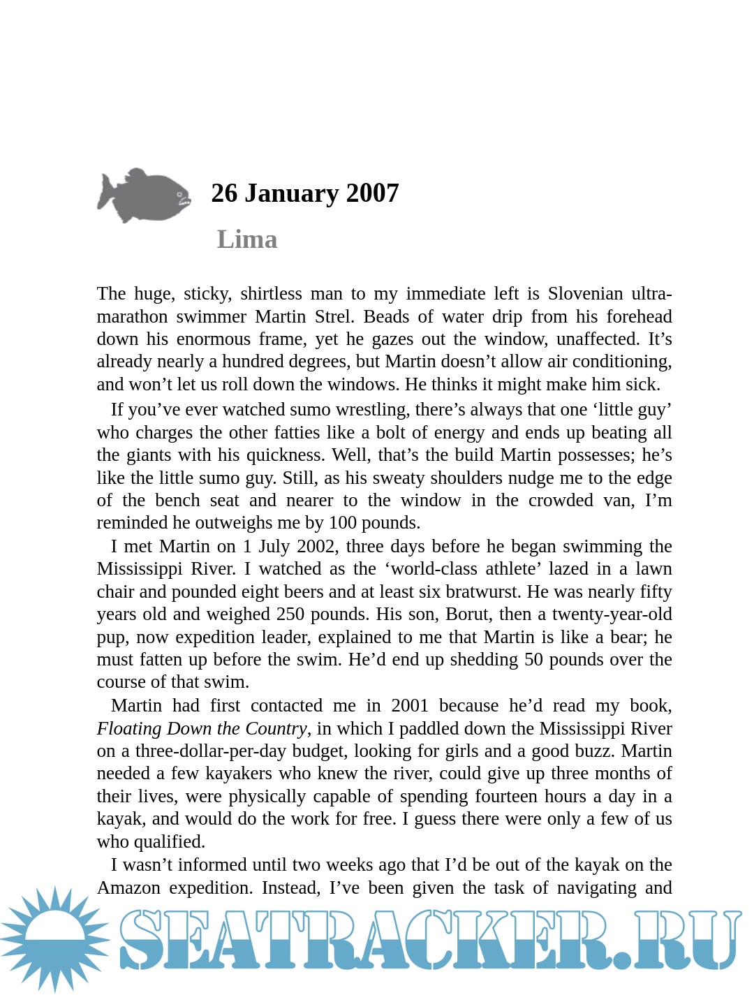 Year: 2007 Language: English Author: Strel M. Genre: Historical Publisher: Lyons Press ISBN: 9780857653239 Format: PDF, EPUB Quality: eBook Pages count: 229 Description: On Sunday, April 8, 200 7, 52-year old Martin Strel completed the first-ever swim of the 3,274-mile-long Amazon River. The Fish Man, as he was called by locals, almost died in the process several times; he encountered deadly piranha, crocodiles, anaconda, river sharks, blistering, relentless sun, dangerous currents, river pirates and drug runners, and the insidious candiru. At the finish his blood pressure was at heart attack level, his entire body full of subcutaneous larvae, and besieged by dehydration, diarrhea, and exhaustion. Strel, who holds multiple Guinness world records for long-distance river swims, undertook this epic Amazon swim to call attention to deforestation and river pollution. His journey was covered by national media around the world, and followed by tens of millions of readers on a website tracking his progress (www.amazonswim.com). A documentary film of his journey will premiere at the Sundance Film Festival in 2008. Drawn from the eloquent and evocative trip diaries of writer Matthew Mohlke, who guided Strel armed with buckets of blood to divert piranha, The Man Who Swam the Amazon is a gripping and inspirational story of perseverance, passion, and endurance: A real-life odyssey of a rare and driven man. Martin Strel is one of the most elite athletes in history. He holds three Guinness world records in distance swimming, and is about to earn his fourth for his Amazon swim. Matthew Mohlke is author of Floating Down the Country, an account of his Mississippi River paddling adventures.