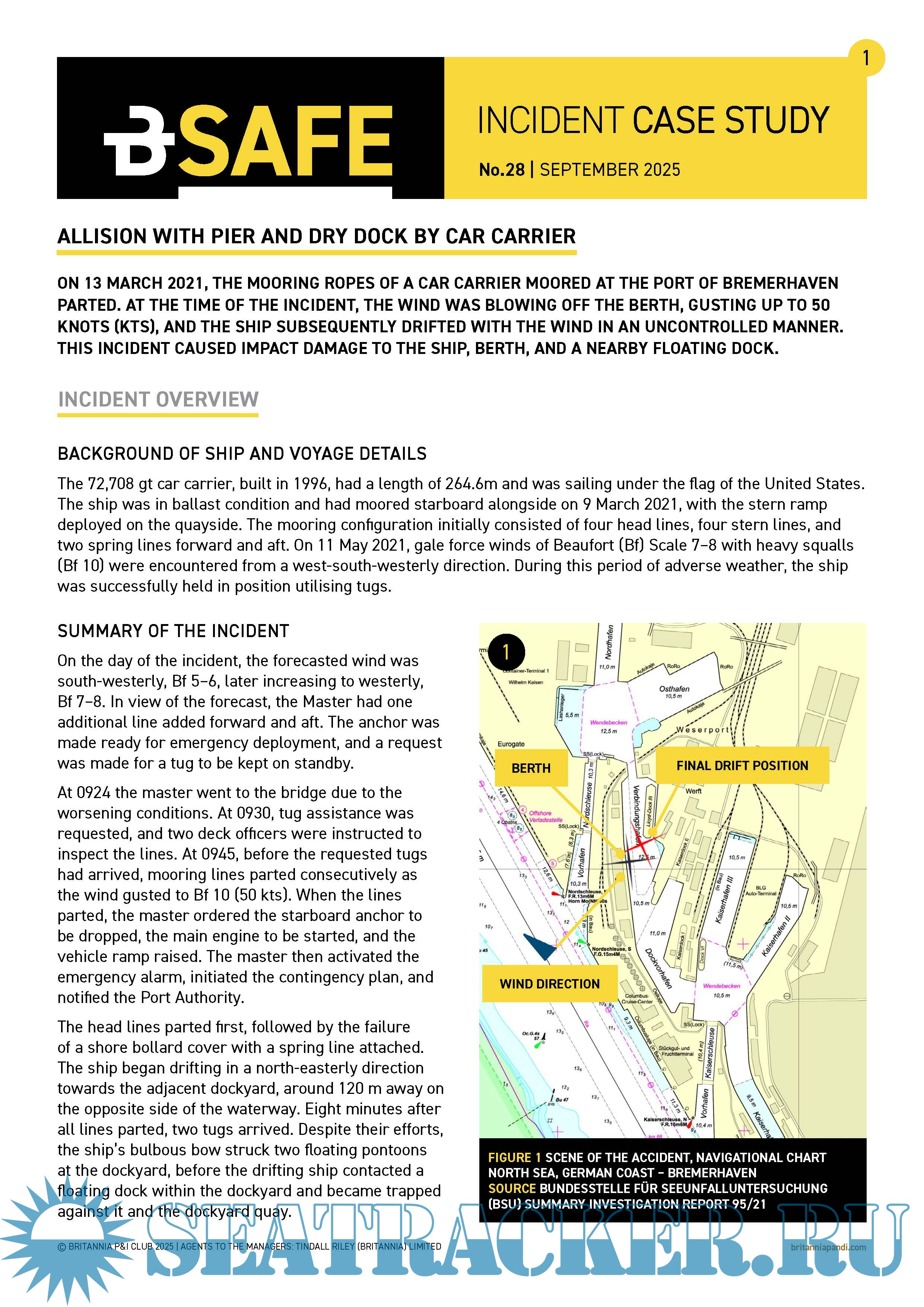 BSAFE INCIDENT CASE STUDY 28: ALLISION WITH PIER AND DRY DOCK BY CAR CARRIER. The mooring ropes of a car carrier moored at the Port of Bremerhaven parted. This incident caused impact damage to the ship, the berth, and a nearby floating dock.