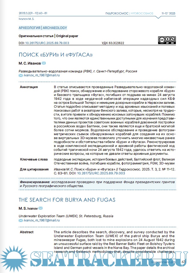 Год выпуска: 2025 Язык: Русский, Английский Автор: группа авторов Жанр: Периодическое издание (журнал) Формат: PDF Качество: Изначально компьютерное (eBook) Количество страниц: 144 Описание: Научный журнал «Гидрокосмос» — первое в России междисциплинарное издание о подводных исследованиях. Он задуман как площадка для обсуждения научных проблем изучения свидетельств взаимодействия людей с морями, озерами и реками, исследованиям смежных занятий и ремесел, а также ныне затопленных участков суши. В повестку издания входят теоретические и методологические вопросы подводных исследований; проблемы морской археологии, связанные с консервацией и реставрацией предметов, обнаруженных в воде; вопросы сохранности объектов культурного наследия; вопросы технического, медицинского, организационного и юридического обеспечения подводных археологических работ. Журнал «Гидрокосмос» создан как инструмент для укрепления сообщества теоретиков и практиков подводных исследований, для обеспечения синергии в дальнейшем развитии отрасли в России.