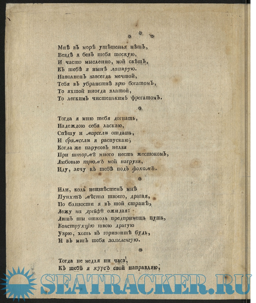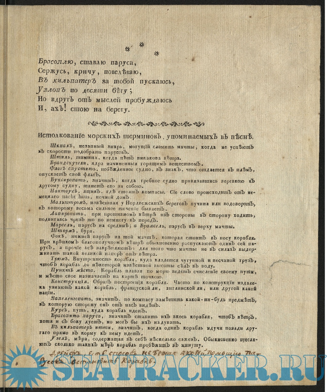 Песня некотораго мореходца изъясняющаго любовь свою теми словами и мыслями, какими по привычке к мореплаванию воображение его наполнено
