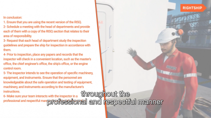 *** RightShip Inspection Awareness Videos 1 - 11 contents: Video 1: Introduction Video 2: Planning for inspection Video 3: Filling out an inspection application form Video 4: What to do once RightShip appoints the inspector Video 5: Are the ship and crew prepared for the RightShip inspection? Video 6: Preparing the ship for inspection - ship management companies Video 7: How to prepare the ship for inspection as the ship’s team Video 8: RightShip inspection - opening meeting Video 9: What happens during a RightShip inspection Video 10: RightShip inspection closing meeting Video 11: RightShip inspection code of conduct ***