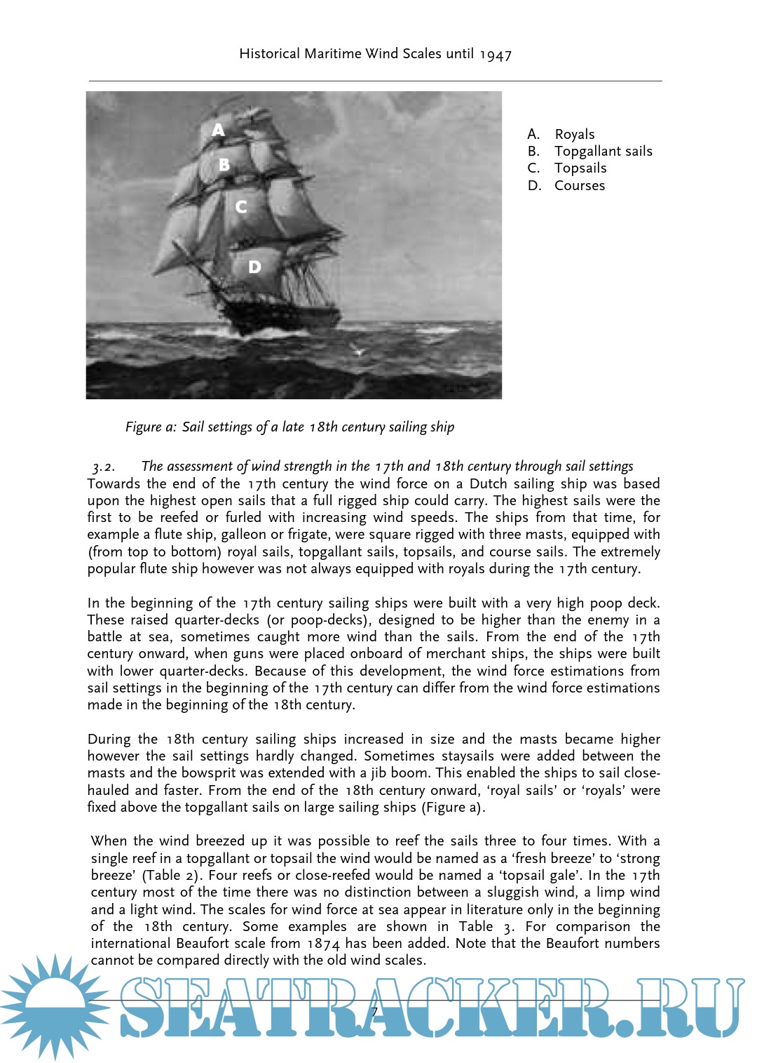 Description: The strongly increasing interest for historical climate data (HISKLIM, CLIWOC, RECLAIM, ACRES) over the past few years led to several projects with the purpose of taking maritime wind data, originally from old ship logs, digitize them and make them available through e.g. a database. In order to be able to interpret the data correctly, additional information about the carried sails of full rigged ships is essential. The so-called metadata is also of great importance for the knowledge of the quality of the observations in existing international climate databases (e.g. ICOADS).