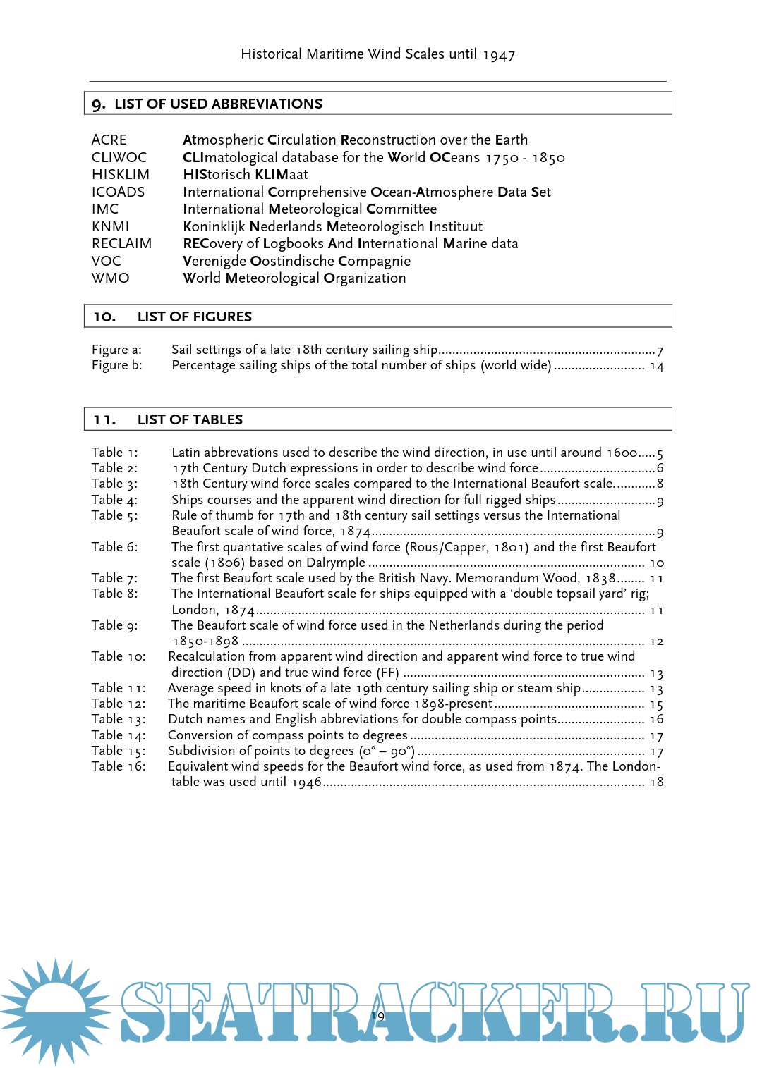 This publication will go in depth into the origins and developments of wind scales that have been used to make subjective wind force estimates. From the 17th century onward a chronological overview is given of the terminology that the crew used among each other in order to exchange information regarding the wind direction and wind force of the ocean.