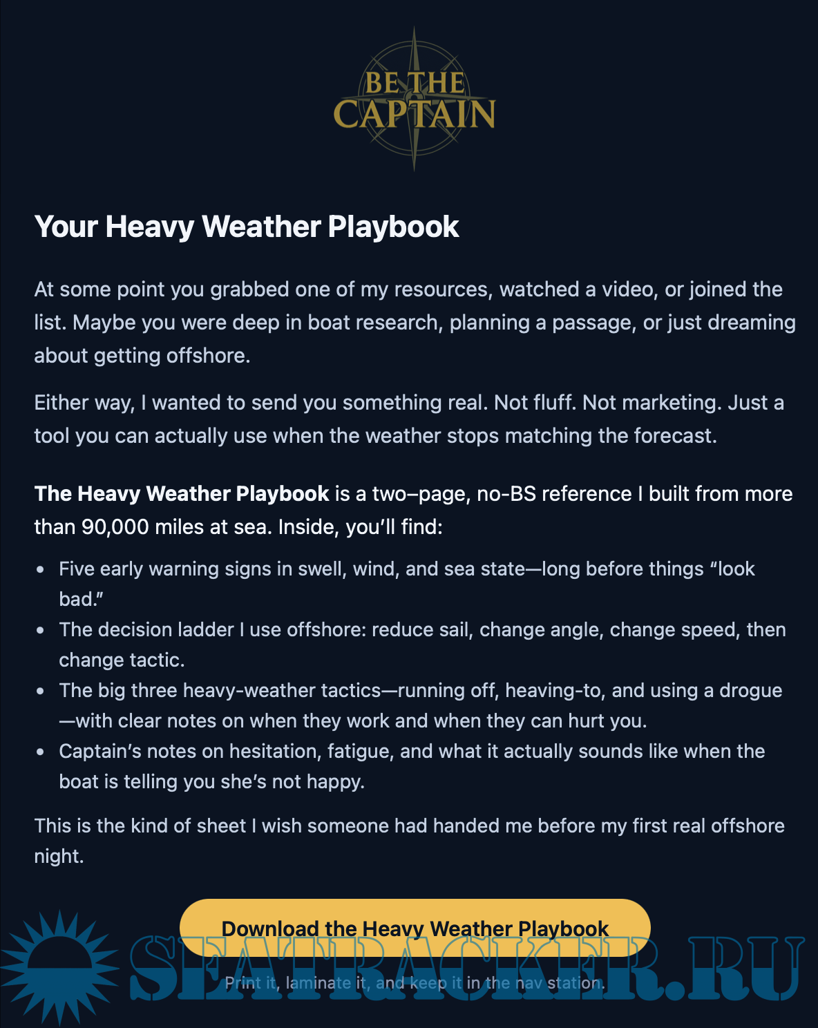 Either way, I wanted to send you something real. Not fluff. Not marketing. Just a tool you can actually use when the weather stops matching the forecast. The Heavy Weather Playbook is a two–page, no-BS reference I built from more than 90,000 miles at sea. This is the kind of sheet I wish someone had handed me before my first real offshore night.