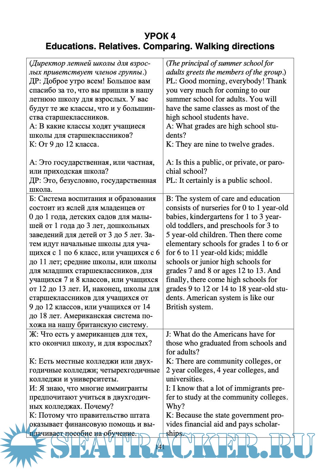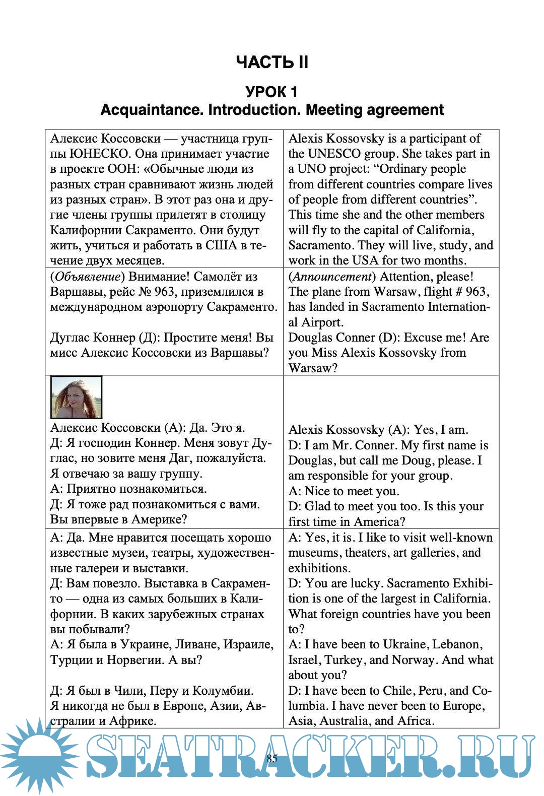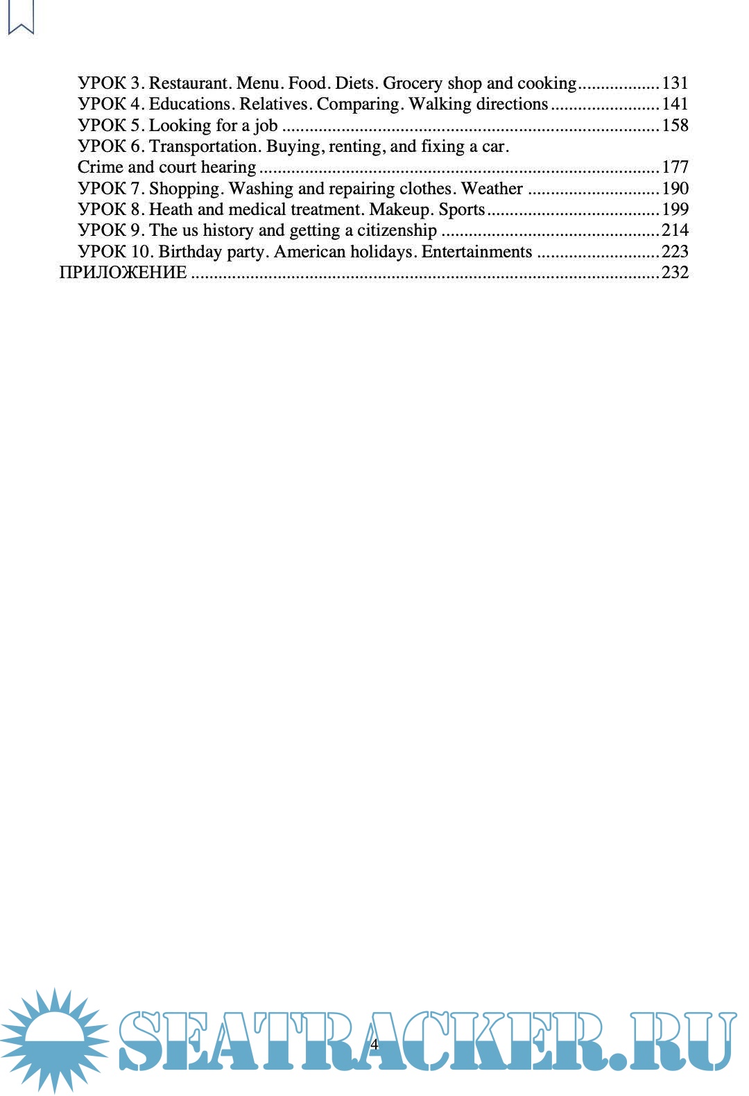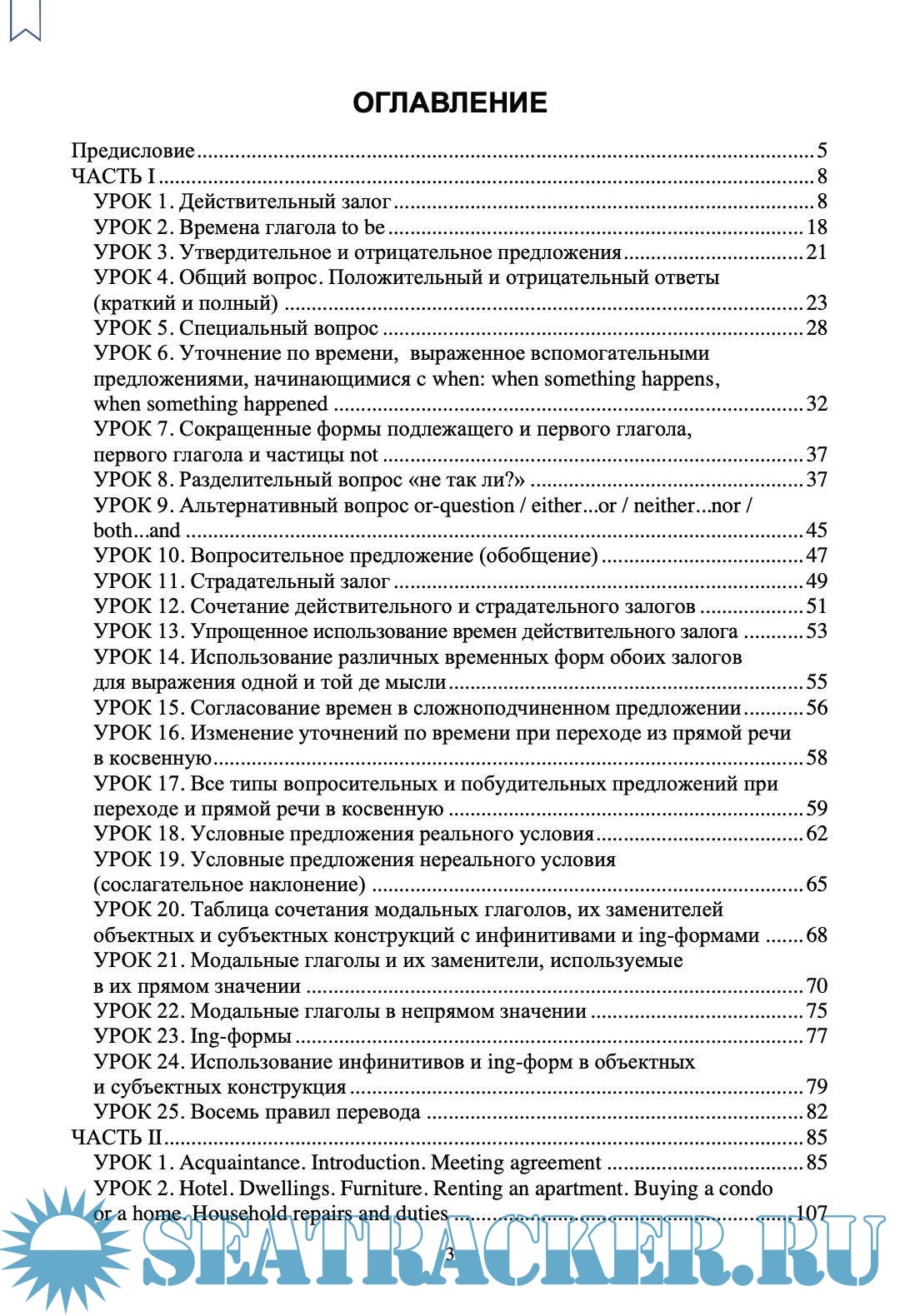 Часть I пособия включает 25 уроков, в которых изложены основные грамматические темы с опорой на русский язык, включая правила перевода, а также даны самостоятельные и контрольные работы по английской грамматике. Часть II включает 10 уроков, где представлены 25 разговорных тем. Каждый урок снабжен упражнениями для выработки навыков англоязычного общения и списком ключевых фраз, удобных для использования. Приложение содержит лексику с русским переводом, организованную поурочно в той последовательности, в которой она встречается в тексте полилогов.