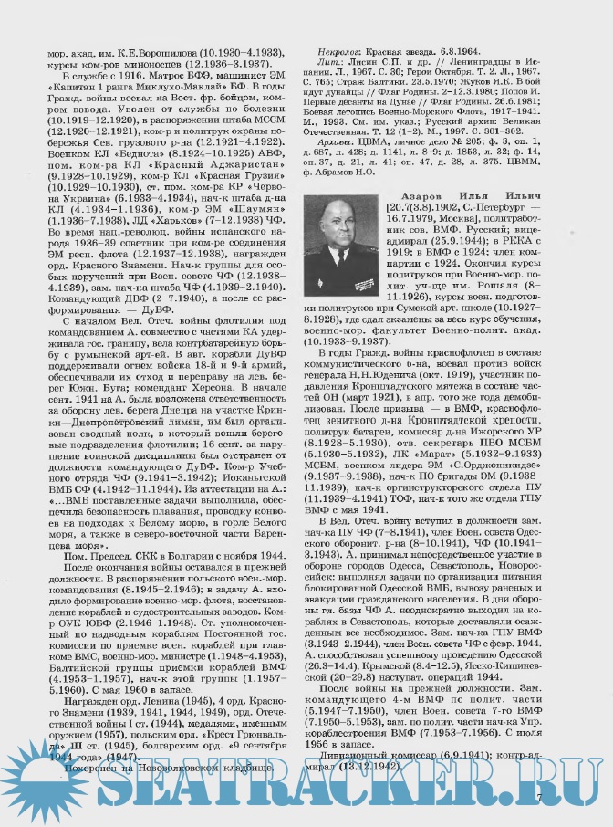 Год выпуска: 2001 Язык: Русский Автор: Лурье В.М. Жанр: История ВМФ Издательство: <kbw Формат: PDF Качество: Изначально компьютерное (eBook) Количество страниц: 279 Описание: Автор не дает собственных оценок, их в какой-то степени заменяют выдержки из подлинных документов — боевых характеристик, аттестаций, наградных листов. Тем не менее в биографиях подробно, с документальной точностью, просматривается судьба каждого из адмиралов и генералов, о многих из которых раньше мы мало что знали. К сожалению, книга выходит в свет, когда все ее герои ушли из жизни. Сознавая свою ответственность перед их потомками, автор документально показывает, каким нередко нелегким и тернистым был путь их отцов и дедов. В судьбе практически каждого были взлеты и падения, в том числе и по причинам, от них не зависящим. Однако в абсолютном большинстве случаев, даже в самых тяжелых ситуациях, вели они себя достойно и мужественно. Автор справочника — научный сотрудник Центрального военно-морского архива В.М. Лурье — много лет работает над сбором материалов о биографиях советских адмиралов и генералов. Им написан ряд биографических статей, опубликованных в Военной и др. энциклопедиях и изданиях. Он является соавтором книги «Командный состав армии и флота в период Великой Отечественной и советско-японской войн 1941-1945 гг.», в течение нескольких лет публикует биографии адмиралов в историческом журнале С.-Петербургского государственного университета «Новый часовой».