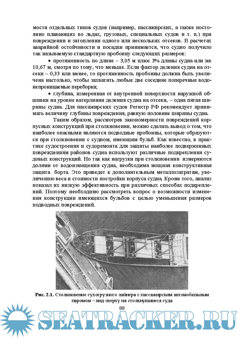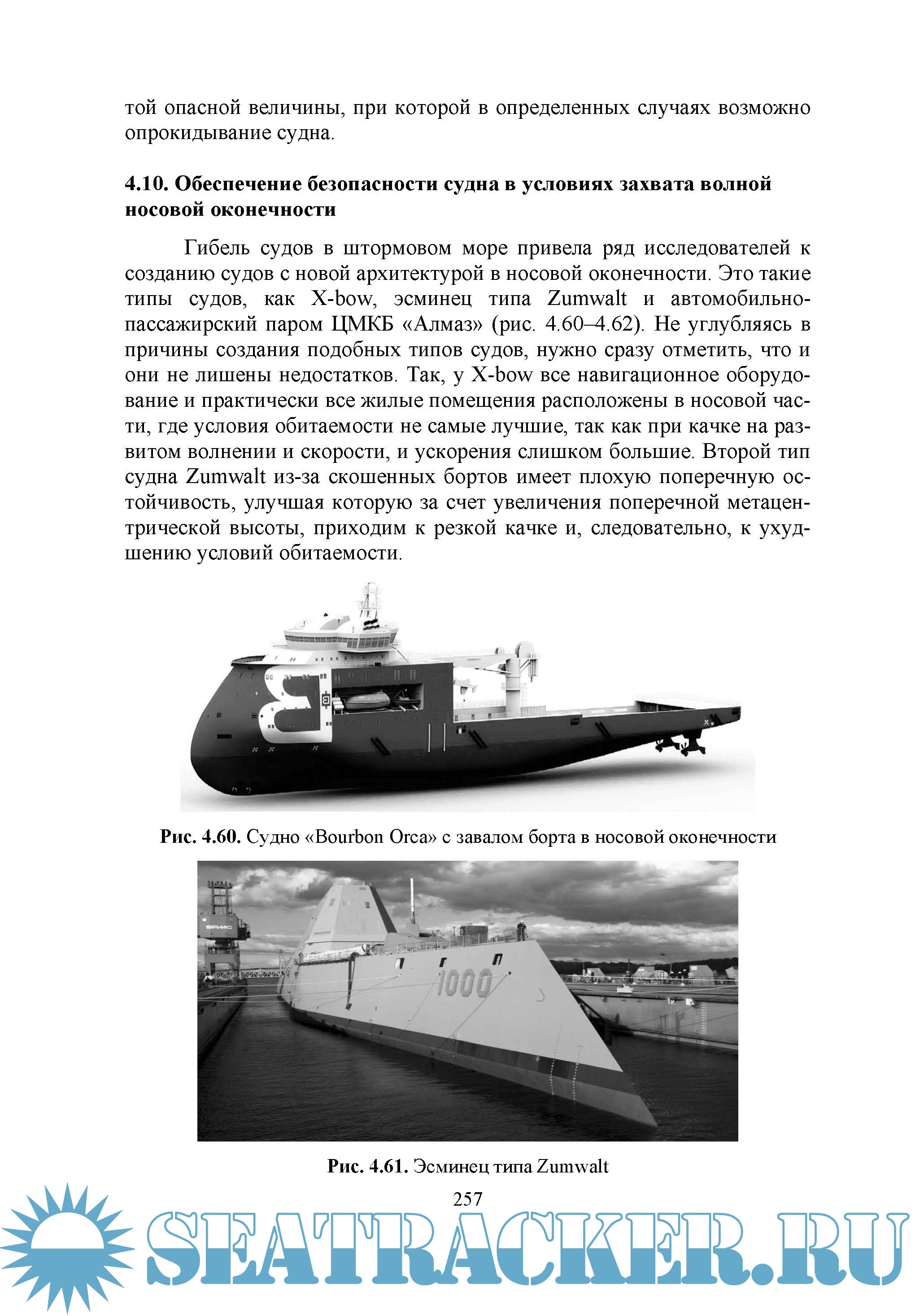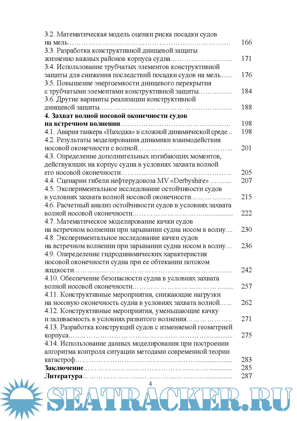 Отдельное место в настоящем издании занимает глава, посвященная обеспечению безопасности судов, находящихся в штормовых условиях, в случае захвата волной их носовой оконечности. Это новый механизм, позволяющий объяснить гибель судов в штормовых условиях не человеческим фактором, как это обычно делается, а неправильным конструктивным оформлением судов в носовой оконечности. При этом авторы показали, что повышение безопасности мореплавания возможно путем изменения корпусных конструкций судов. Такие новые конструкции предлагаются в настоящей работе, большинство из них защищены патентами на изобретение.