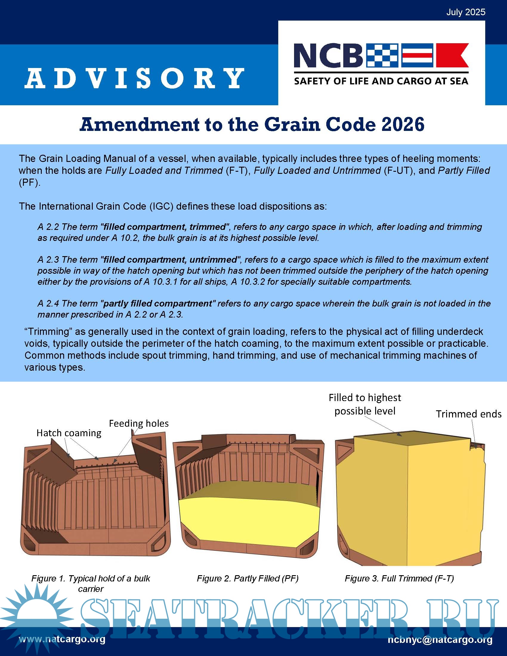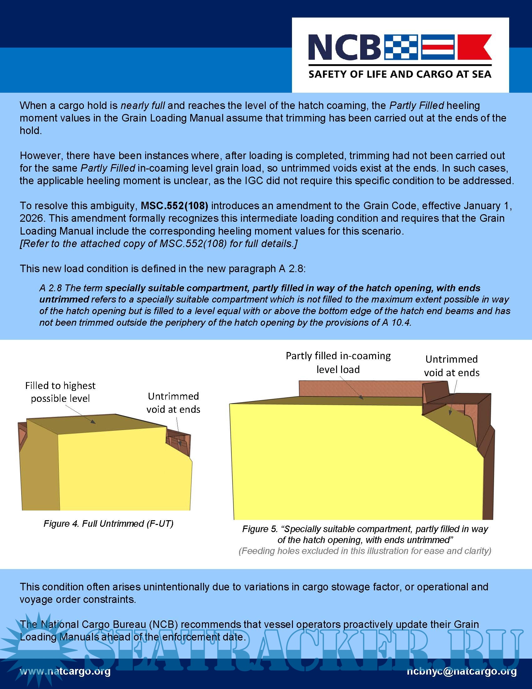 Organisations such as the ‘National Cargo Bureau’ have recommended proactive update of grain loading manuals to take account of the new loading condition. It is therefore likely that the authorities at many loading ports will apply extra scrutiny to ships who may fit this criterion, to ensure that the grain loading manual correctly reflects the actual loading condition.