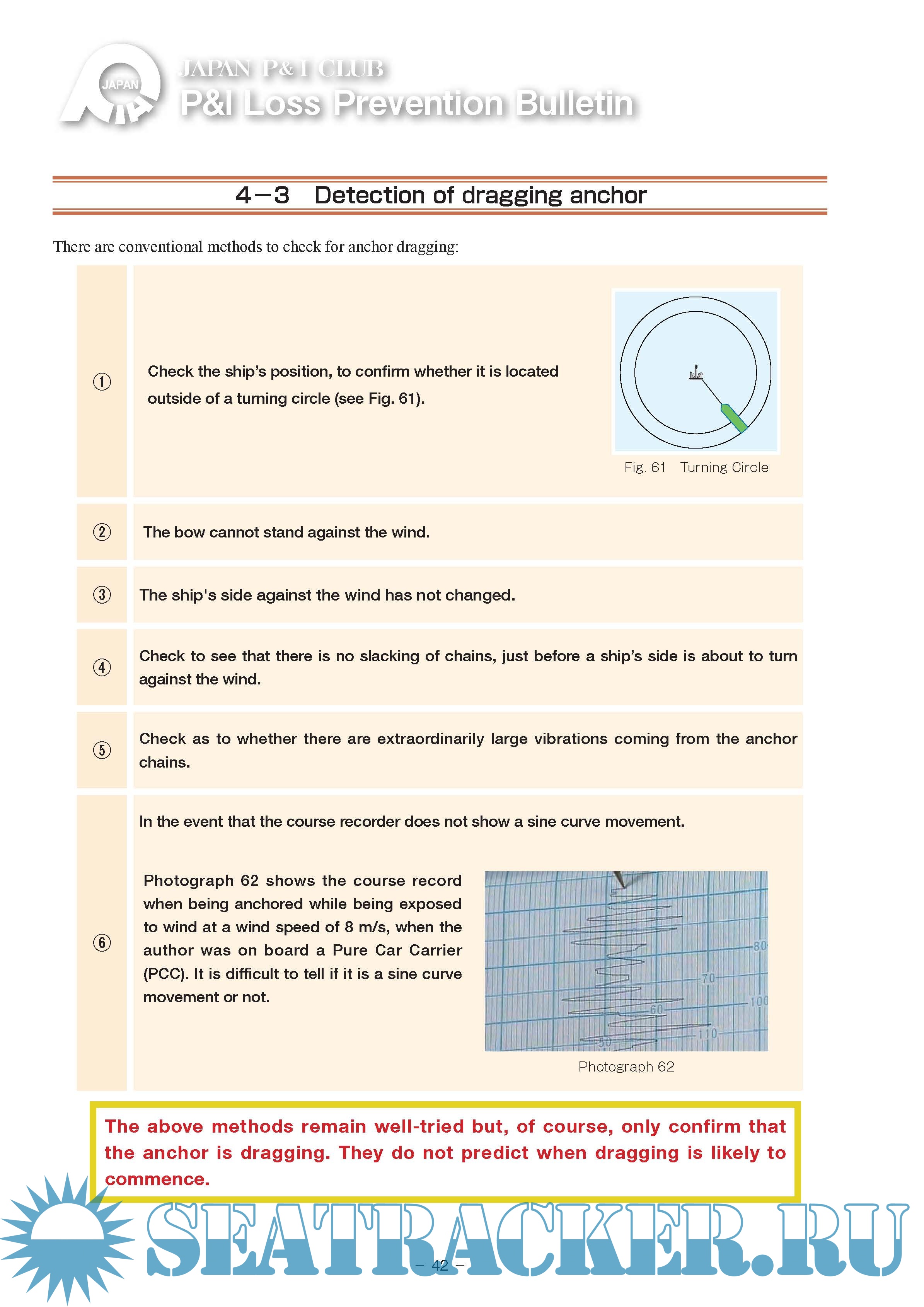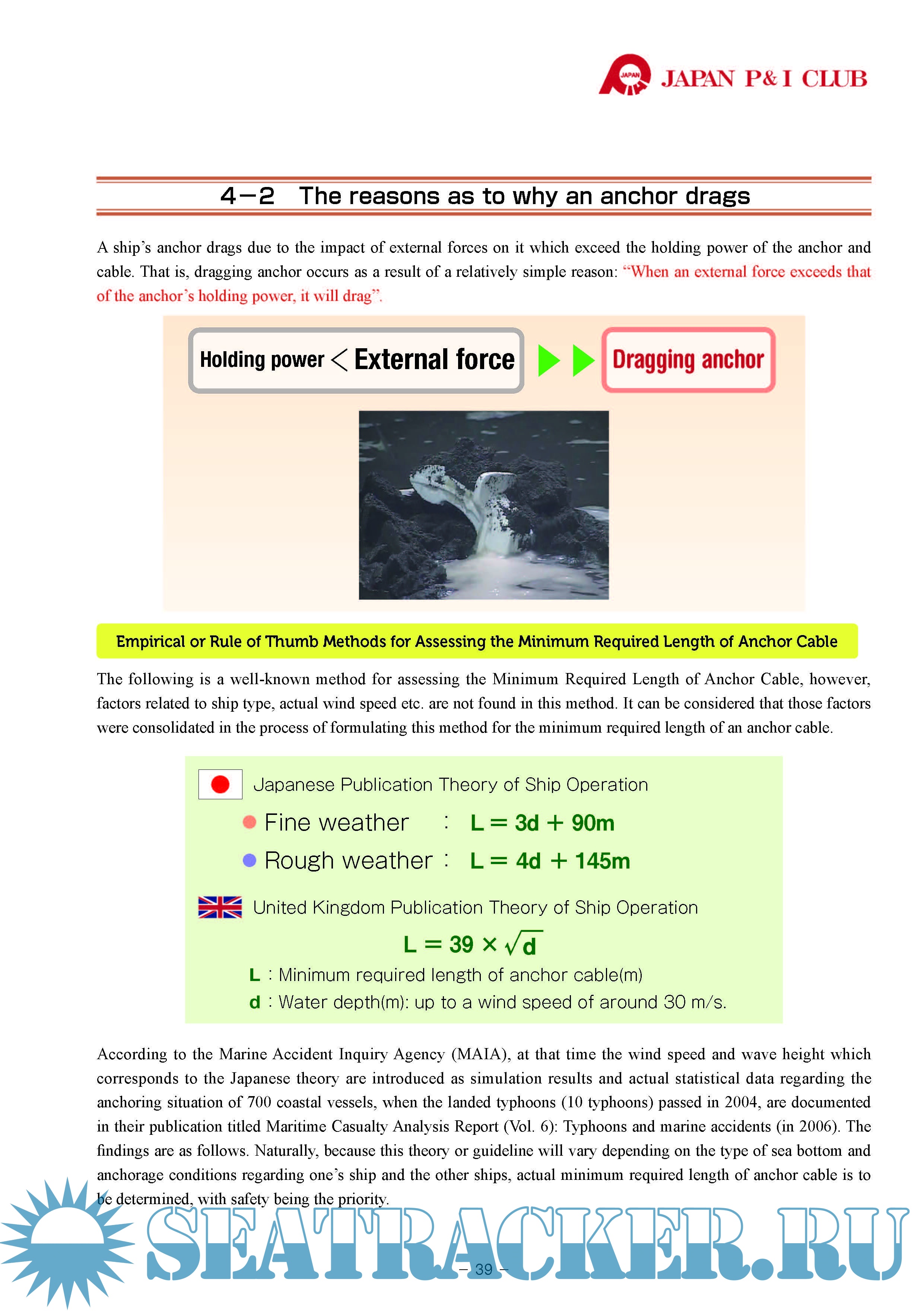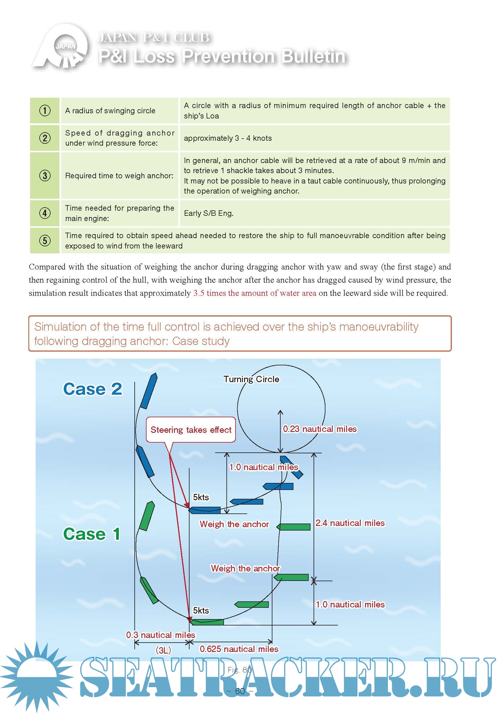 Year: 2018 Language: English Author: Japan P&I Club Genre: Bulletin Publisher: Japan P&I Club Edition: Volume 43 July 2018 Format: PDF, XLSx Quality: eBook Pages count: 66 Description: P&I Loss Prevention Bulletin | Dragging Anchor - Case Studies and Preventive Measures In the event of anchoring, it is common to carry out single anchor mooring, using one of the anchors outfitted on either side of the ship. However, due to strong winds from typhoons or violent storms, as a dragging anchor preventative measure, one must be ready to drop the snubber anchor on the opposite side (to the sea bottom), or carry out two-anchor mooring or ride at two anchors. Accidents due to a dragging anchor are not only caused by Typhoons, but also occur during gales. However, according to statistics they predominantly occur when a typhoon has just passed. First, it is necessary to understand how typhoons move. * Anchoring Holding Power Calculation in .xlsx format included.