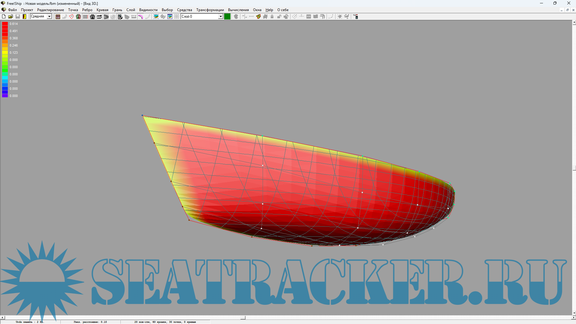 Подскажите, пожалуйста, как активировать включение ручного ввода координат ЦТ и массу в свойствах слоя. Эти функции неактивны. Никак. Эта фича была зарезервирована в более ранних версиях. Проще импортировать кубик как Part (если нет сохраненного, то создать) и для него задать массу, и, перемещая внутри модели, задать нужные координаты его ЦТ. Не забудьте отключить для него учет в гидростатике в свойствах слоя - должен создавать только силу веса. Подскажите пожалуйста каким образом в программе, рассчитать положение ЦВ при изменении угла крена/дифферента, при постоянном водоизмещении? Или как вариант - можно ли выполнить определение начального угла дифферента или крена при заданном водоизмещении и положении ЦТ? 1. Сделать зеркализацию модели 2. Отключить в Свойствах слоев симметричность 3. Включить Автоперемещение модели к ОЛ в установках проекта 4. Задать осадку соответствующую расчетному водоизмещению 5. В свойствах слоев задать плотности материала и толщины. Суммарный вес слоев должен соответствовать расчетному водоизмещению в тоннах 6. Задать угол крена или дифферента и запустить расчет гидростатики. Обычно необходимо повторять расчет гидростатики 2-3 раза для нахождения соответствующей заданному весу осадки 7. В таблице результатов расчета гидростатики выводятся координаты ЦВ и параметры остойчивости. Помощь к FREE!ship Plus Вопрос 1: Почему при импорте VRML геометрии не могу посчитать гидростатику, ходкость и не сохраняется проект в DXF и других форматах? Ответ: При импорте VRML геометрии начало координат часто находится не в корме (на кормовом перпендикуляре AP) как принято во FREE!ship'e. Необходимо сместить координаты всех точек в нос и задать проектные длину, ширину и осадку. Как это сделать смотрите на видео: FS_1.avi и/или FS_2.avi и в документации п.4.1 (стр. 23) и п.14.2 (стр. 45). Для просмотра видео фрагментов может понадобиться установить кодек TSCC, ссылка в Downloads. Вопрос 2: Как сделать поперечные переборки в FREE!ship Plus? Ответ: Есть несколько способов. Первый более удобен для случая, когда надо переборку создать как деталь (part) и работать в дальнейшем с ней отдельно. Пример разработан Manuel Morales. Скачать PDF (0.4 Мб) можно отсюда Adding_Bulkheads_as_parts.pdf . Второй способ удобнее применять при расчетах непотопляемости методом исключения отсека, образованного переборками, из общего водоизмещения. Скачать видео с установкой поперечной переборки с координатой X=55 м можно здесь - Adding_Bulkheads(RU).avi - 20Мб или отсюда . Аналогично можно создавать продольные переборки и палубы. Для расчета гидростатики в свойствах слоев с переборками надо отключать учет их в расчетах гидростатики, а для получения их разверток, включать свойство развертываемости. PS: К сожалению, окошко с координатами точки управления на видео не видно, но догадаться, как вводятся изменения координат, не сложно. Вопрос 3: Как сделать развертки поверхностей в FREE!ship Plus? Ответ: Во-первых, для разворачиваемых поверхностей (слоев) надо включить это свойство в "Диалоговом окне свойств слоев" (Ctrl+L) Во-вторых, эта поверхность должна быть действительно разворачиваемой на плоскость. Затем действовать как на видеофрагменте получения развертки переборки из предыдущего вопроса PrintDevelopPlate.avi - 0,5 Мб или отсюда. При необходимости печати развертки на бумаге лучше пользоваться принтерами с функцией "Печать постера" или с установкой драйве