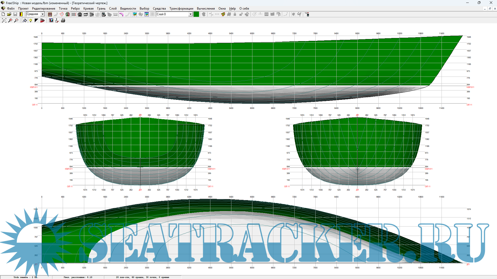 Ответ: При импорте VRML геометрии начало координат часто находится не в корме (на кормовом перпендикуляре AP) как принято во FREE!ship'e. Необходимо сместить координаты всех точек в нос и задать проектные длину, ширину и осадку. Как это сделать смотрите на видео: FS_1.avi и/или FS_2.avi и в документации п.4.1 (стр. 23) и п.14.2 (стр. 45). Для просмотра видео фрагментов может понадобиться установить кодек TSCC, ссылка в Downloads.
