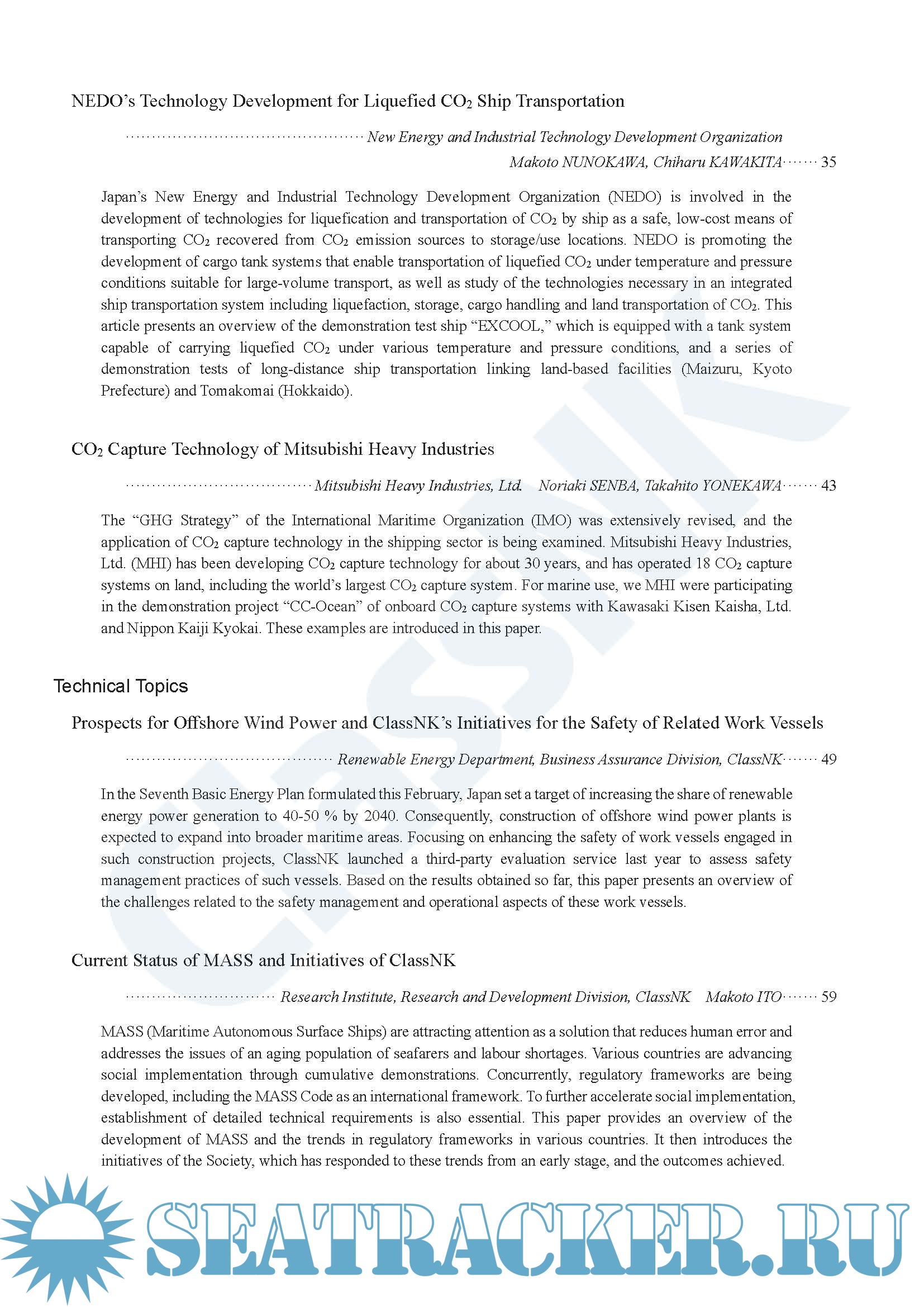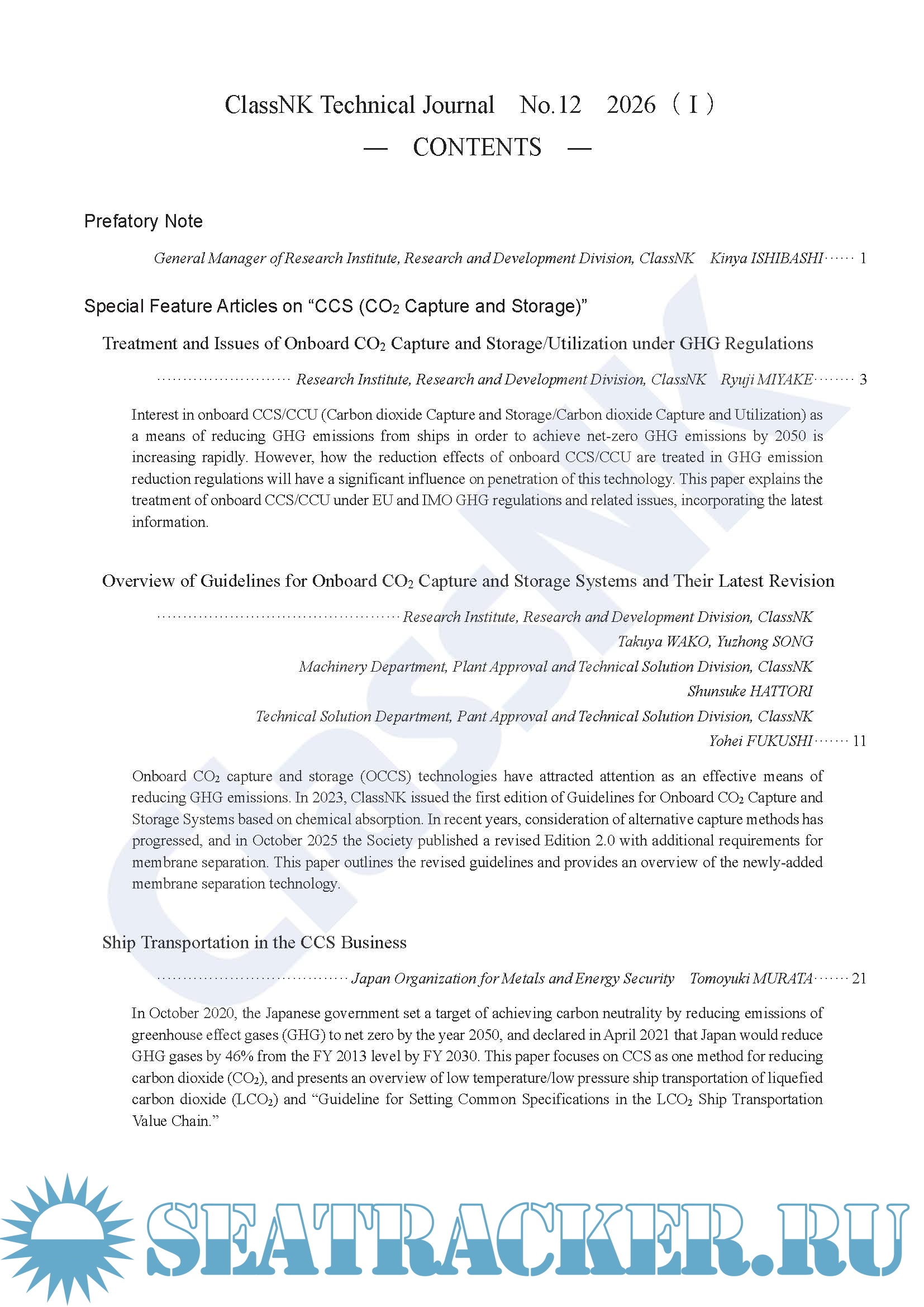Year: 2026 Language: English Author: ClassNK Genre: Periodical (journal) Publisher: ClassNK Edition: No.12 2026(Ⅰ) Format: PDF Quality: eBook Pages count: 118 Description: ClassNK Technical Journal is a technical publicity journal which is published with the aim of contributing to the progress of technology in the maritime industry by providing information on the technological activities and research achievements of ClassNK to a wider audience. The previous issue (ClassNK Technical Journal No. 11) reported on technological trends and the latest results of research and development related to the theme of lectures at the ClassNK R&D Forum held in January 2025, “Towards Safer and Environmentally Friendly Ships.” This Special Feature on “CCS (CO2 Capture and Storage)” also presents a commentary on technologies related to large-scale CCS facilities and onboard CO2 capture equipment from a private-sector company which has record of about 30 years in the development of CO2 capture technologies and actual operational results of 18 land-based CO2 capture plants, including the world’s largest.