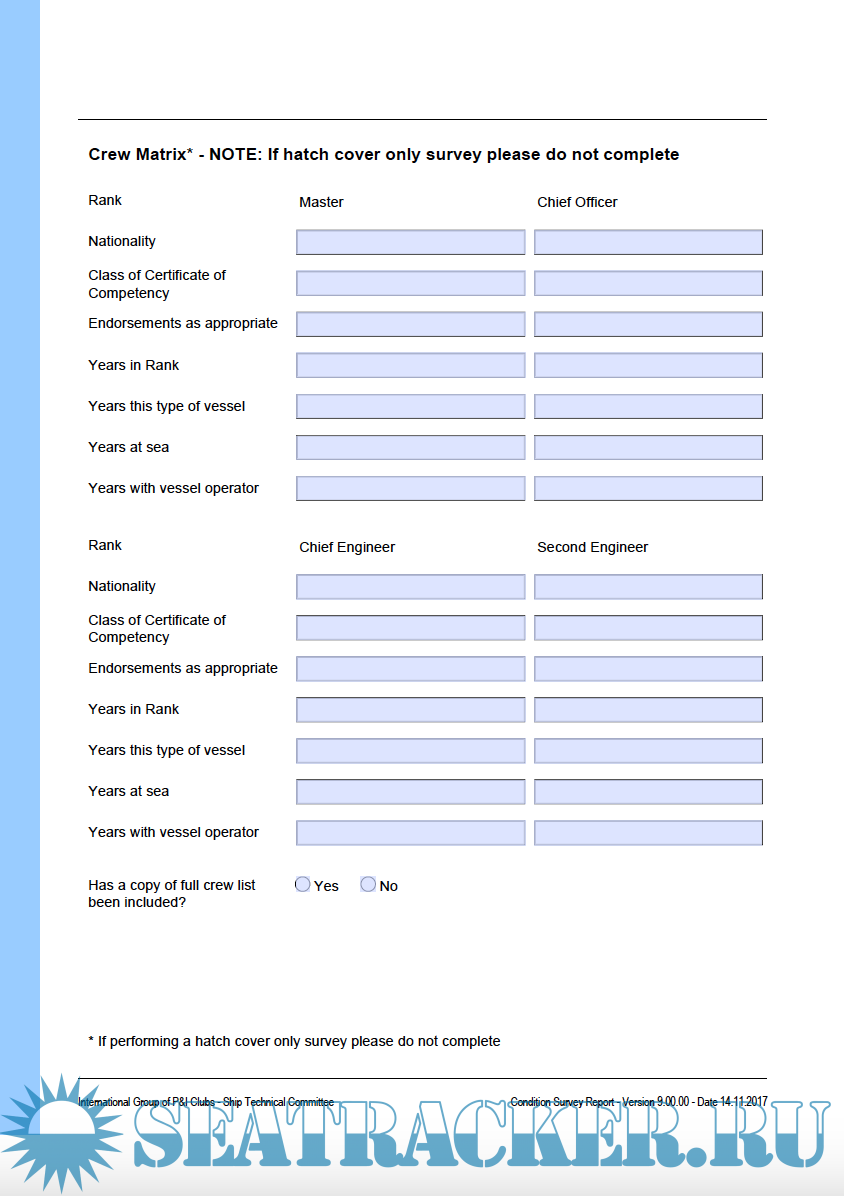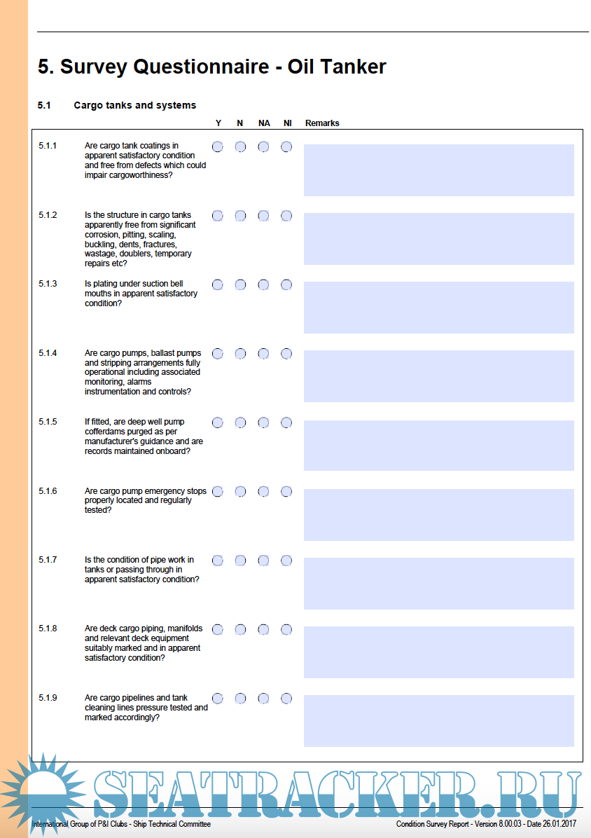 -IG SHIP CONDITION SURVEY QUESTIONNAIRE PART C – REEFER SHIP IG SHIP CONDITION SURVEY REPORT FORM – PART A – ALL SHIP TYPES IG SHIP CONDITION SURVEY QUESTIONNAIRE – PART B – ALL SHIP TYPES IG SHIP CONDITION SURVEY QUESTIONNAIRE – PART C BARGES – DRY CARGO BULK IG SHIP CONDITION SURVEY QUESTIONNAIRE – PART C BARGES – LIQUID CARGO IG SHIP CONDITION SURVEY QUESTIONNAIRE – PART C – BULK, GENERAL CARGO AND OTHER IG SHIP CONDITION SURVEY QUESTIONNAIRE – PART C – CHEMICAL TANKER IG SHIP CONDITION SURVEY QUESTIONNAIRE – PART C – CONTAINER SHIP IG SHIP CONDITION SURVEY QUESTIONNAIRE – PART C – FISHING IG SHIP CONDITION SURVEY QUESTIONNAIRE – PART C – GAS TANKER IG SHIP CONDITION SURVEY QUESTIONNAIRE – PART C – HATCH COVERS – MULTI COVERS IG SHIP CONDITION SURVEY QUESTIONNAIRE PART C – OIL TANKER IG SHIP CONDITION SURVEY QUESTIONNAIRE PART C – PASSENGER RO-PAX IG SHIP CONDITION SURVEY QUESTIONNAIRE PART C – PASSENGE IG SHIP CONDITION SURVEY QUESTIONNAIRE PART C – RO RO IG SHIP CONDITION SURVEY QUESTIONNAIRE PART C – TUGS IG SHIP CONDITION SURVEY QUESTIONNAIRE PART D – DEFECT LIST FOR ALL SHIPS