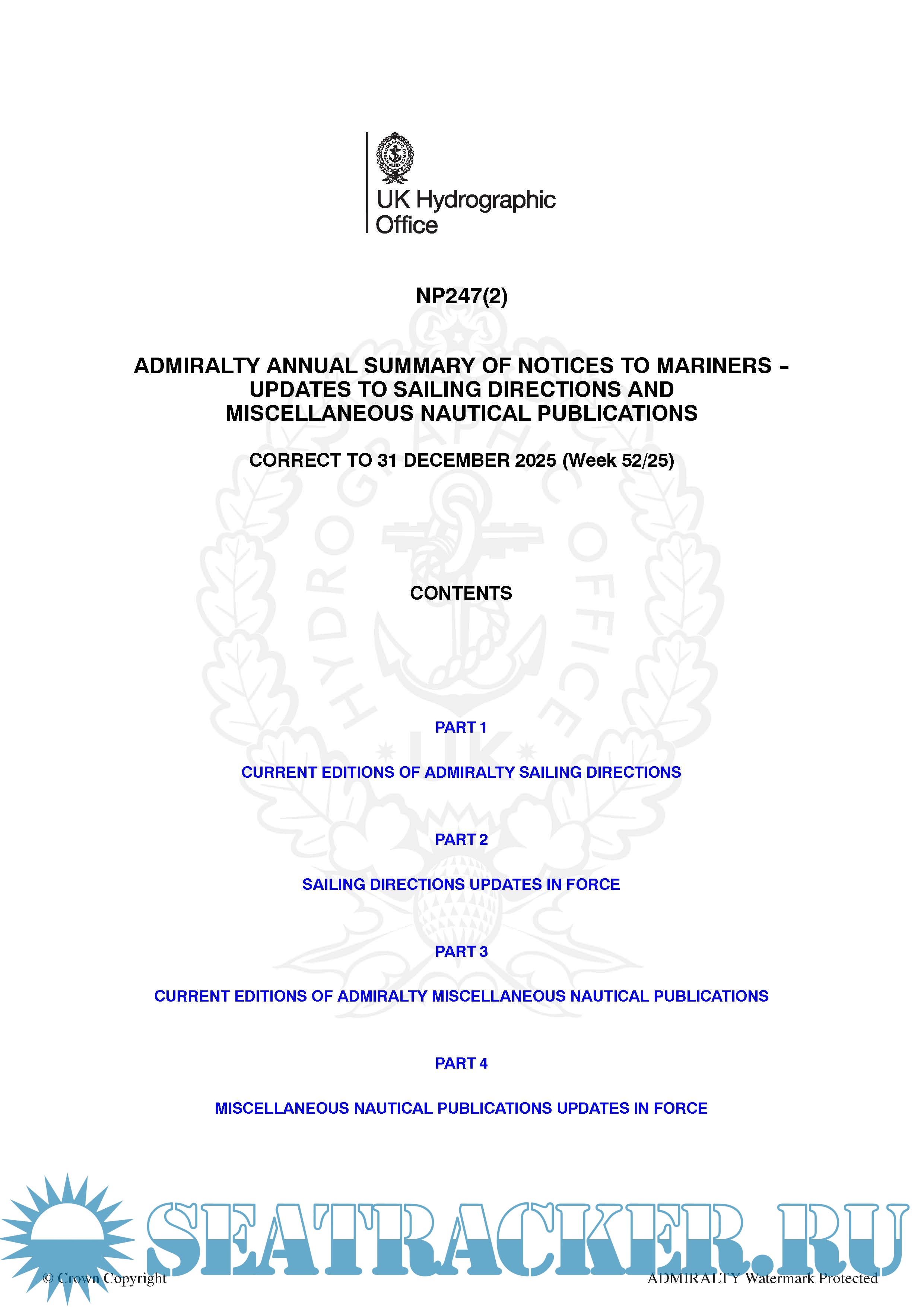 Year: 2026 Language: English Author: UKHO Genre: Documentation Publisher: United Kingdom Hydrographic Office (UKHO) Edition: January 2026 Format: PDF Quality: eBook Pages count: 606 + 807 Description: Annual Summary of ADMIRALTY Notices to Mariners 2026 (NP247) To supplement Weekly NMs, the UKHO produces an Annual Summary of Notices to Mariners (NP247). This publication contains the Annual Statutory Notices to Mariners, a summary of Temporary and Preliminary Notices to Mariners still in force at the start of the year, and a Cumulative Summary of Amendments to ADMIRALTY Sailing Directions. The paper version of the Annual Summary of Notices to Mariners is published annually in January. Correct to 31 December 2025 (Week 52/25)